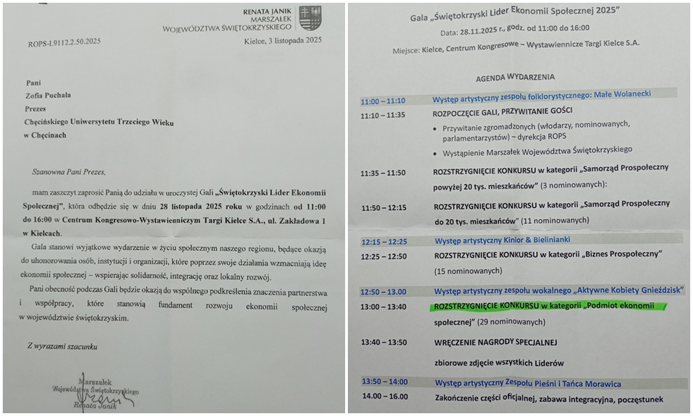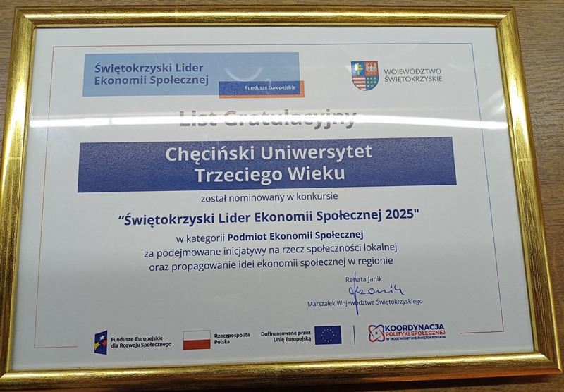 Gospodarzem uroczystości była marszałek Renata Janik, która wraz z członkiem Zarządu Anitą Koniusz, poseł na Sejm Anną Krupką oraz senatorem RP Krzysztofem Słoniem wręczała listy gratulacyjne w poszczególnych kategoriach i statuetki laureatom IX edycji Nagrody. Wydarzenie odbyło się z udziałem radnych Sejmiku: wiceprzewodniczącej Sejmiku Magdaleny Zieleń, Małgorzaty Krzywdy, Grzegorza Cepila, jak również dyrektor Departamentu Wdrażania Europejskiego Funduszu Społecznego Katarzyny Kubickiej. Galę poprowadziła dyrektor Regionalnego Ośrodka Polityki Społecznej Elżbieta Korus wraz z zastępcą Arkadiuszem Ślipikowskim. Wydarzenie było realizowane w ramach projektu „Koordynacja polityki społecznej w województwie świętokrzyskim” współfinansowanego z Funduszy Europejskich. Kategoria “Samorząd Prospołeczny powyżej 20 tys. mieszkańców” .Kategoria “Samorząd Prospołeczny do 20 tys. mieszkańców”. Kategoria “Biznes Prospołeczny”. Kategoria “Podmiot ekonomii społecznej”. W tej kategorii wśród 29 instytucji nominowanych był Chęciński Uniwersytet Trzeciego Wieku. Po wręczeniu nagród i pamiątkowych zdjęciach, uroczystość zakończyła się zaproszeniem do wspólnej integracji i poczęstunku.