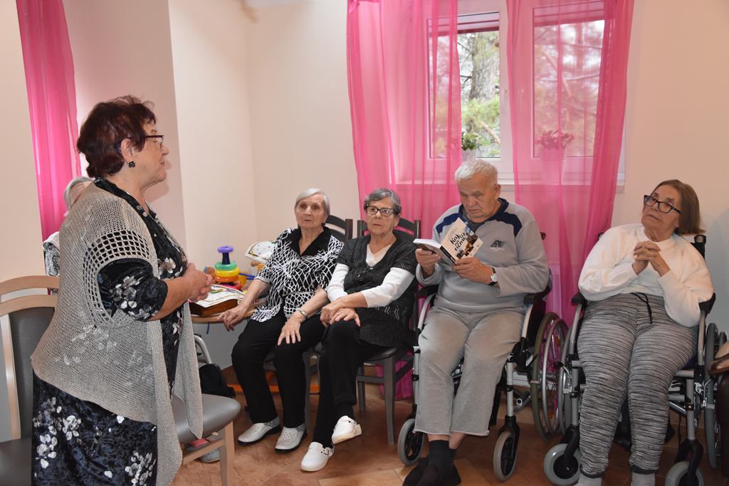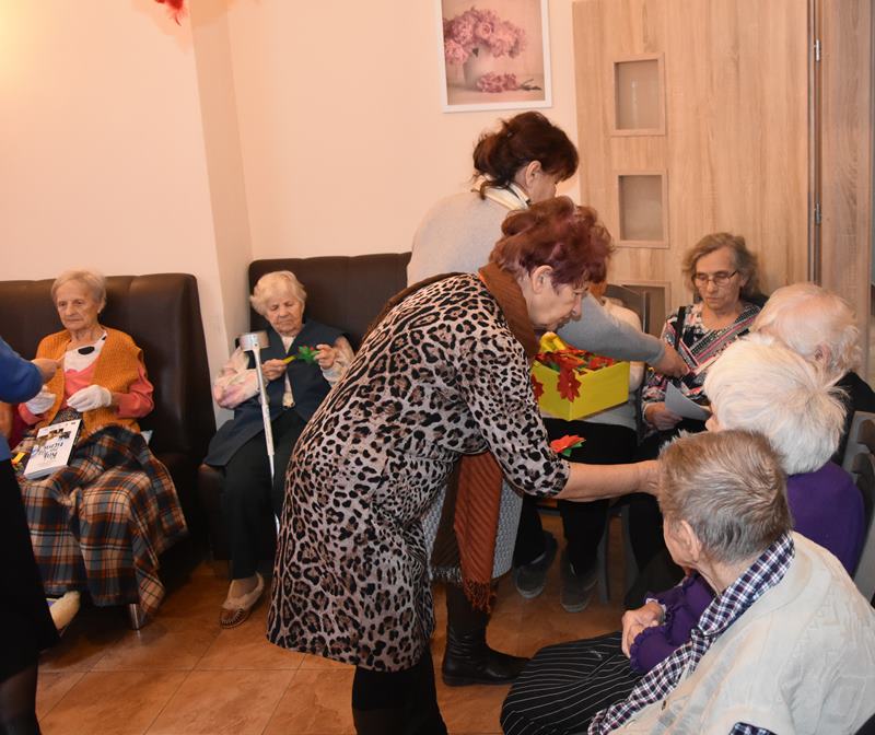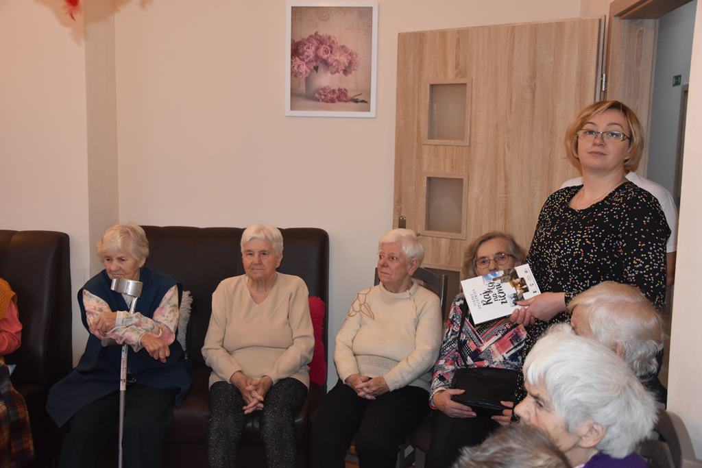Nasza Pani Prezes Zenona Dołęgowska przekazała na ręce kierowniczki kilka egzemplarzy książki „Raj na tej ziemi”, której jest autorką Opowiedziała o działalności Chęcińskiego Uniwersytetu i wyjaśniła cel naszej wizyty. Zachęciła tym sposobem pensjonariuszy do rozmowy. Opowiadali oni o swoim pobycie, o świetnych obiadach i bardzo dobrej opiece jaką mają zapewnioną ze strony personelu. Widać było, że ufają swoim opiekunom i wyrażali się