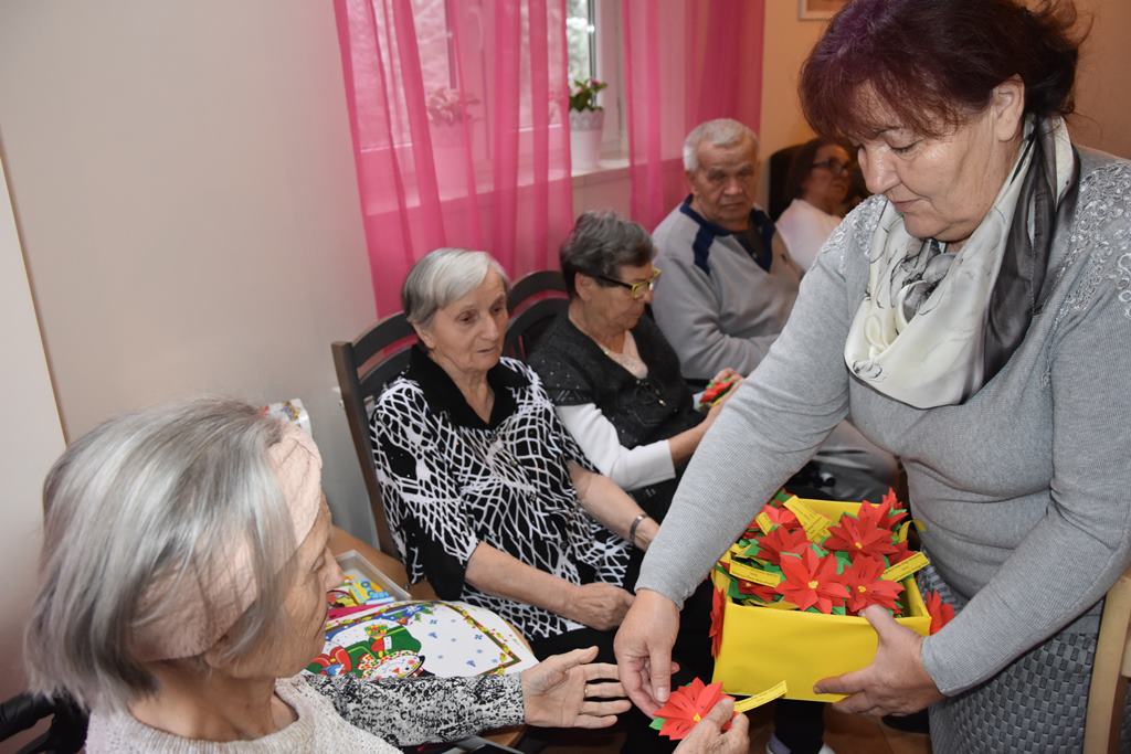 Przywitała nas Pani Kierownik i zaprowadziła do oczekujących w świetlicy pensjonariuszy. Ponieważ część z nich jest leżąca spotkaliśmy się z grupą około 20 kilku osób. W związku ze zbliżającymi się Świętami Bożego Narodzenia pragnęliśmy wnieść chociaż odrobinę radościi wywołać nawet maleńki uśmiech na ich twarzach.