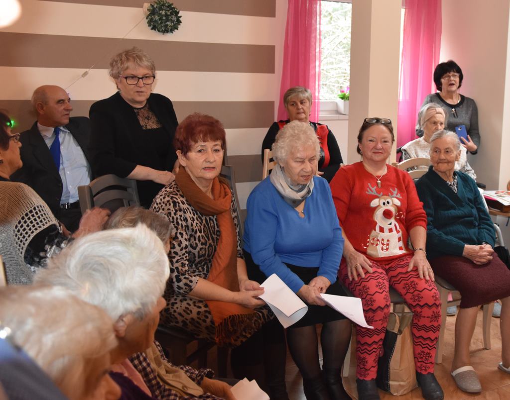 Przedświąteczne wizyty wiążą się przeważnie z kolędami. Część naszej grupy to przedstawiciele chóru „Jesienna sonata”. Kol. Wanda przygotowała zbiór kolęd z powiększonym drukiem i rozdała wszystkim osobom. Po chwili w budynku rozległ się wspaniały śpiew naszych chórzystów i pensjonariuszy. Okazało się, że Ci starsi, schorowani ludzie śpiewali bez tekstów, pamiętali doskonale słowa kolęd. Męskie głosy Stasia i Janusza dodawały szczególnego uroku a koleżanki Helenka , Gosia i Wiesia pomagały chłopakom