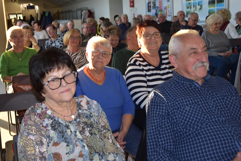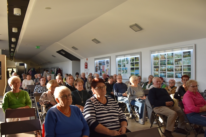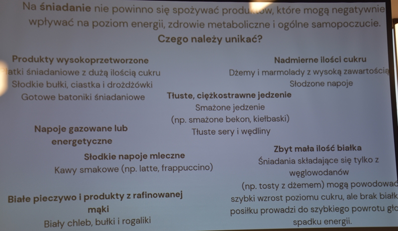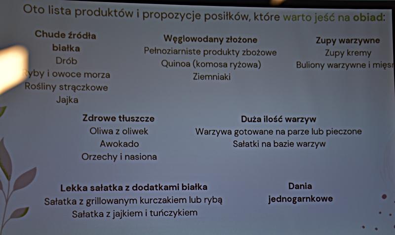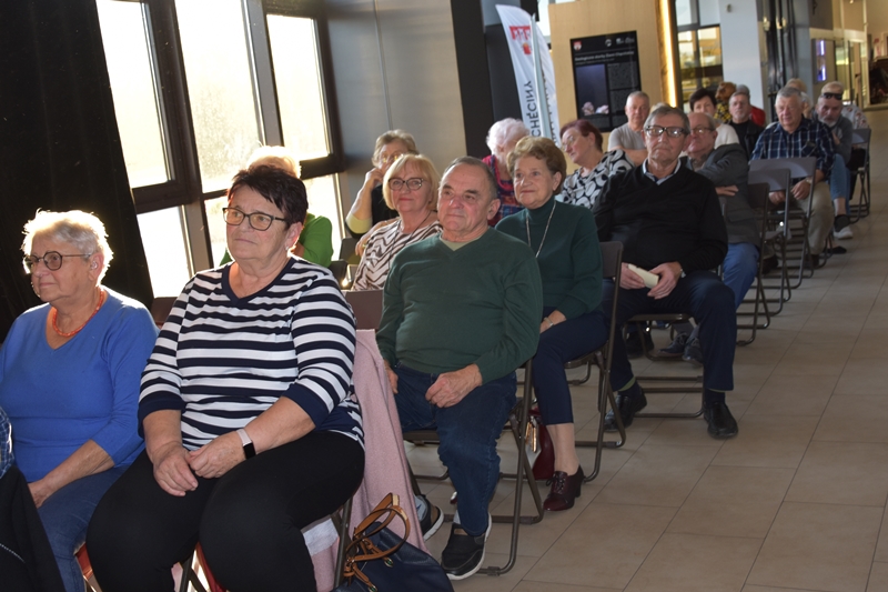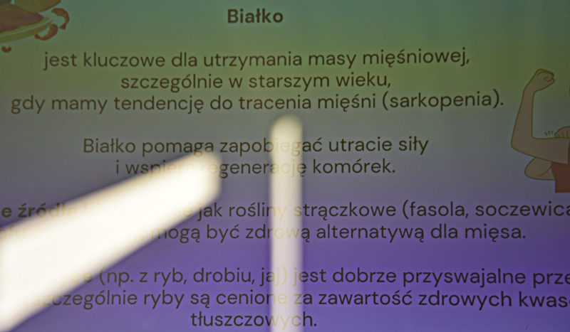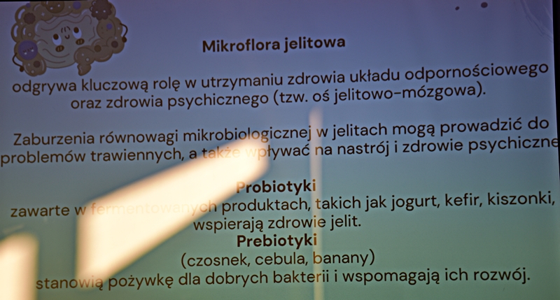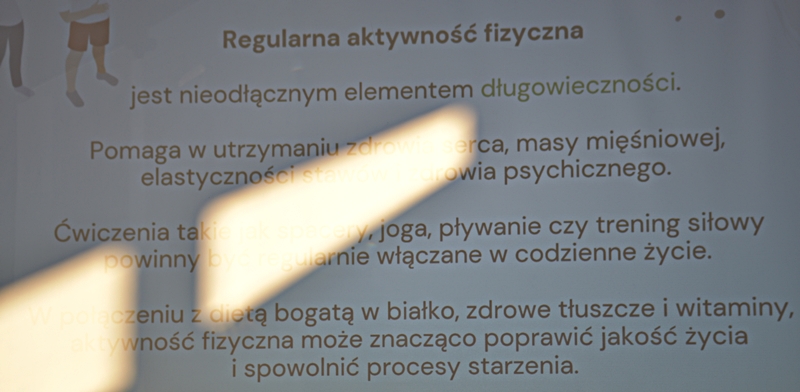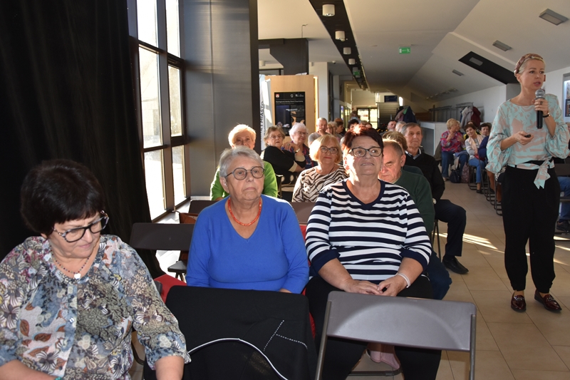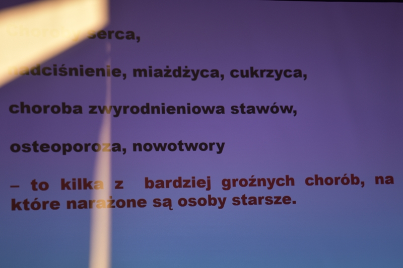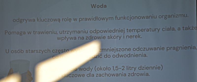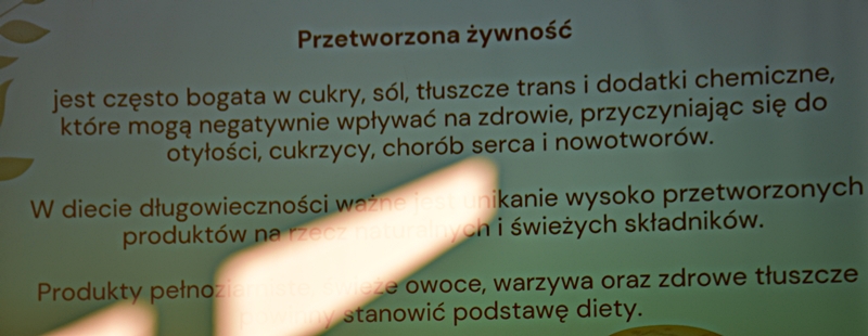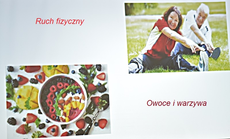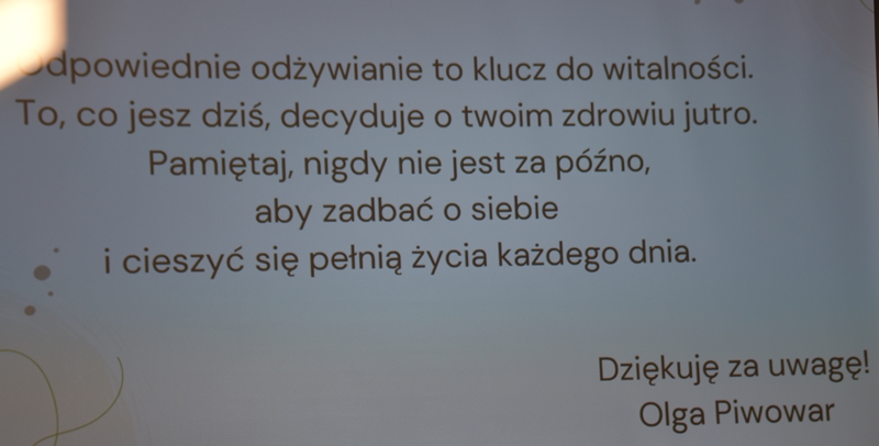 Pani Olga Piwowar - dietetyk, która przedstawiła nam ,,dietę długowieczności’’. W diecie seniora należy uwzględnić spożywanie dużej ilości: warzyw i owoców, które dostarczają niezbędnych antyoksydantów, witamin i minerałów; orzechów, nasion i pełnoziarnistych produktów, które wspierają układ sercowo-naczyniowy przez co zmniejszają ryzyko cukrzycy i otyłości; białka - najlepiej pochodzenia zwierzęcego (powoduje utrzymanie masy mięśniowej, uczucie sytości, wspiera regenerację komórek); oliwy z oliwek, awokado, które są źródłem zdrowych tłuszczów, redukują stany zapalne, zmniejszają ryzyko chorób neurodegeneracyjnych (demencja, choroba Alzheimera); kwasy omega-3 zawarte między innymi w rybach, które są niezbedne do prawidłowego funkcjonowania mózgu. W celu uzupełnienia mikroflory jelitowej należy spożywać probiotyki (jogurt, kefir) i prebiotyki (czosnek, cebula, banany), które stanowią pożywkę dla dobrych bakterii i wspomagają ich rozwój. Bardzo ważna w diecie jest ilość wypitej wody, która pomaga w trawieniu, utrzymaniu odpowiedniej temperatury ciała, wpływa na zdrowie skóry i nerek. Osoby starsze często nie odczuwają pragnienia co w efekcie może doprowadzić do odwodnienia. W ciągu doby należy wypić 1,5-2 litry wody. W diecie seniora należy też uwzględnić witaminy i minerały takie jak : wit.D, wapń, magnez, cynk i selen, ponieważ pomagają w zapobieganiu chorobom przewlekłym i wspomagają układ odpornościowy. W prawidłowej diecie należy unikać wszelkiej przetworzonej żywności, bogatej w sól, cukry, tłuszcze zwierzęce i dodatki chemiczne. Nieodłącznym elementem długowieczności jest regularna aktywność fizyczna, nigdy nie jest za późno, aby zadbać o siebie i o swoje zdrowie.