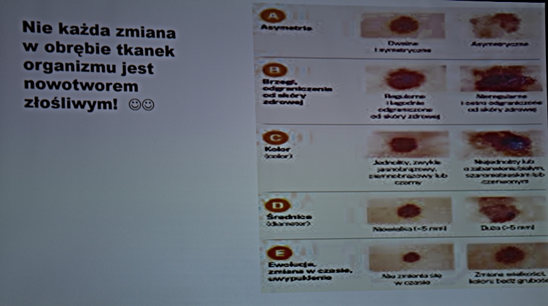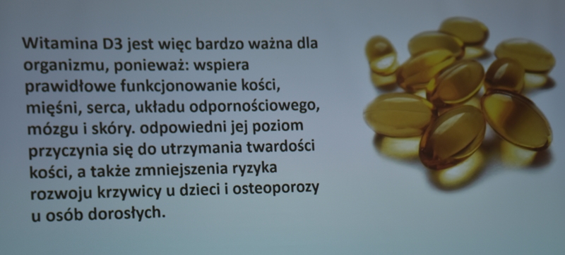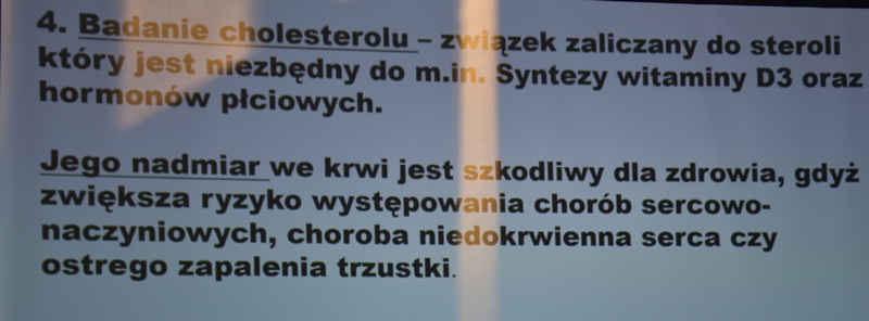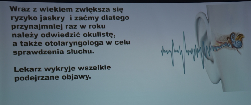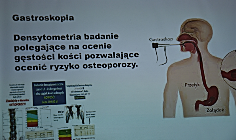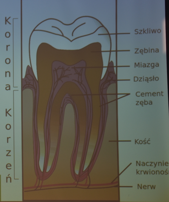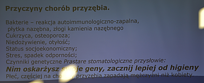 Wykład Pani mgr dypl. higieny stomatologicznej Katarzyna Obarska, która opowiedziała jak zdrowa jama ustna wpływa na nasze ogólne samopoczucie i stan naszego zdrowia. Przedstawiła nam przyczyny chorób przyzębia (bakterie, złogi kamienia nazębnego, niedożywienie, cukrzyca, osteoporoza), oraz że każde krwawienie z dziąseł powinno nas zaniepokoić, ponieważ nie jest to normalna sprawa. Częściej na choroby przyzębia zapadają mężczyźni niż kobiety. Powinniśmy dość często odwiedzać gabinety stomatologiczne - rekomendacją jest, aby wizyta odbywała się raz na pół roku nie tylko wtedy, kiedy nam coś dolega. Braki w uzębieniu powodują nieodwracalne zmiany w stawach twarzoczaszki, zatem ubytki należy uzupełniać protezą. Protezy należy przechowywać w pojemnikach suchych i przewiewnych a nie w wodzie.