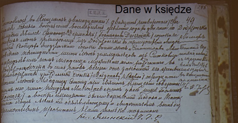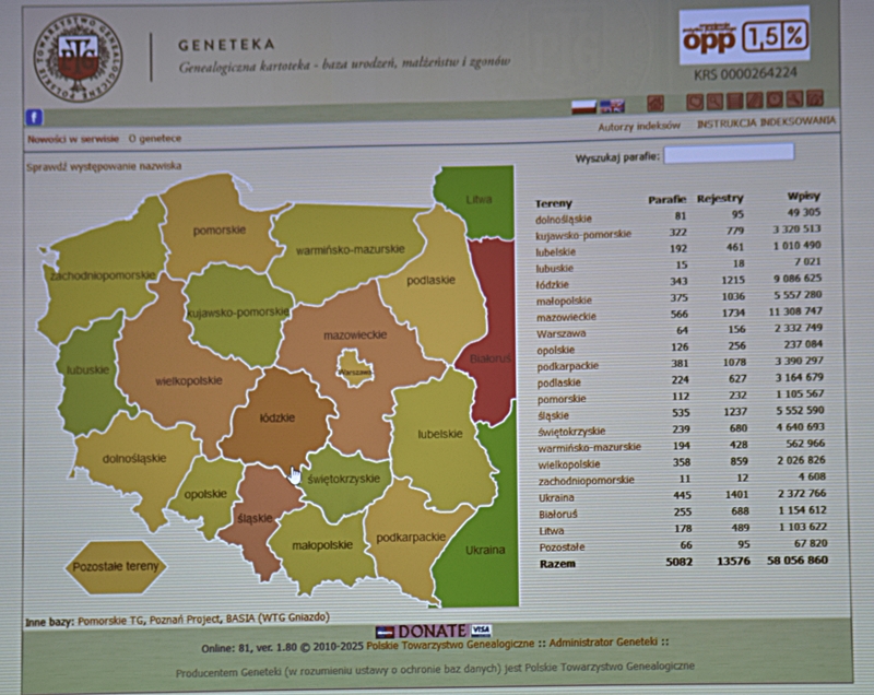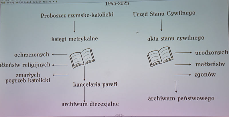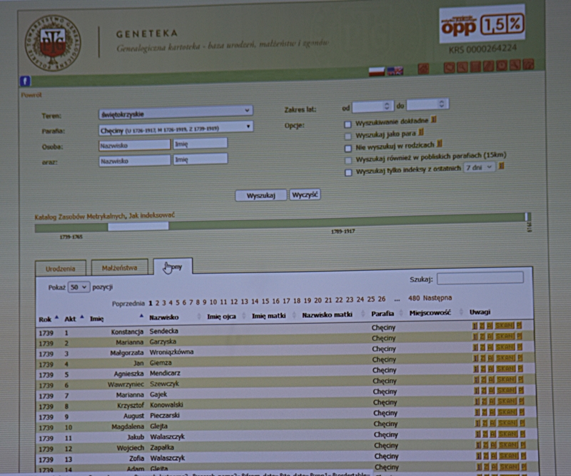 Pan Maciej wskazał nam gdzie i w jaki sposób poszukiwać danych naszych przodków, jeśli chcemy zbudować drzewo genealogiczne swojej rodziny. Wiemy już, że w drzewie genealogicznym przodkowie ,,po mieczu" oraz ,,dziadek ojczysty" i ,,babka ojczysta" są ze strony ojca, a przodkowie ,,po kądzieli" oraz ,,dziadek macierzysty" i ,,babka macierzysta" są ze strony matki. Po zaborach nasze ziemie znalazły się w Królestwie Polskim - czyli pod zaborem rosyjskim i język rosyjski był językiem urzędowym. Od 1826 r. do 1945 r. były prowadzone w parafiach księgi metrykalne jednakowe dla wszystkich wyznań. Do I wojny światowej zapisy były w jęz. rosyjskim, jako urzędowym. Do kancelarii parafialnej przychodziło z rodzicem 2 świadków - mężczyzn, którzy poświadczali urodziny dziecka, jego płeć, jednocześnie odbywał się chrzest dziecka i nadanie imion. A zatem w księgach parafialnych z tego okresu znajdziemy zapisy dotyczące ludzi ochrzczonych i tych, którzy zawarli ślub kościelny, lub mieli katolicki pogrzeb. Do roku 1945 ksiądz prowadził 2 księgi: jedną dla kościoła, drugą dla urzędu stanu cywilnego. Po wojnie zostało to rozdzielone. Jeśli danych swoich przodków nie znajdziemy w kancelarii parafialnej, ani w USC, to znaczy, że stare dokumenty zostały przekazane do Archiwum Państwowego w Kielcach, lub Archiwum Diecezjalnego w Kielcach i tam trzeba ich poszukiwać. Możemy też samodzielnie, siedząc w domu poszukiwać potrzebnych nam danych w internecie na takich stronach: