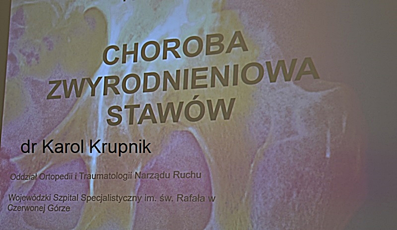 Wykład wygłosił Pan dr Karol Krupnik – Oddział Ortopedii i Traumatologii Narządu Ruchu. Wojewódzki Szpital Specjalistyczny im. św. Rafała w Czerwonej Górze. Pan doktor w bardzo przystępny sposób wyjaśnił nam co to jest choroba zwyrodnieniowa, jak jej zapobiegać i jak ją się leczy.