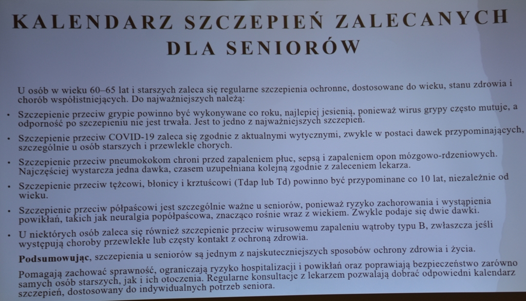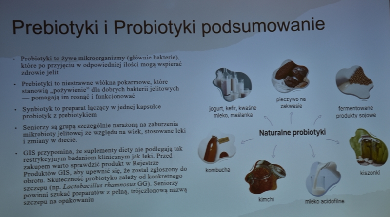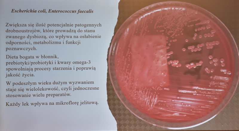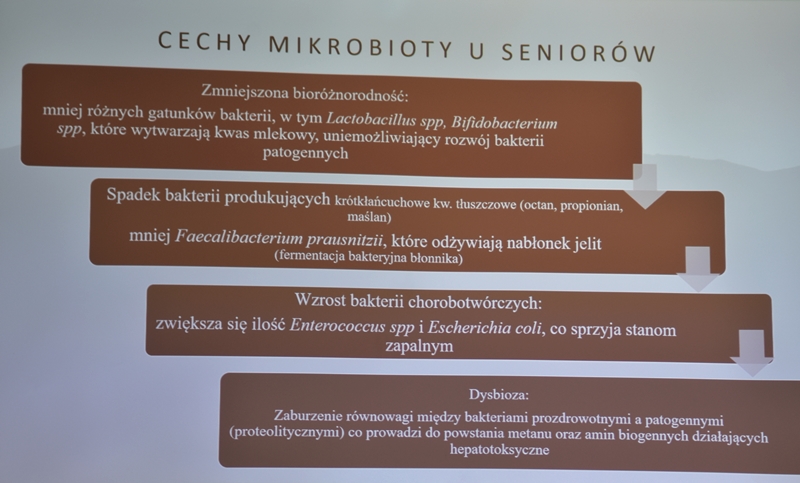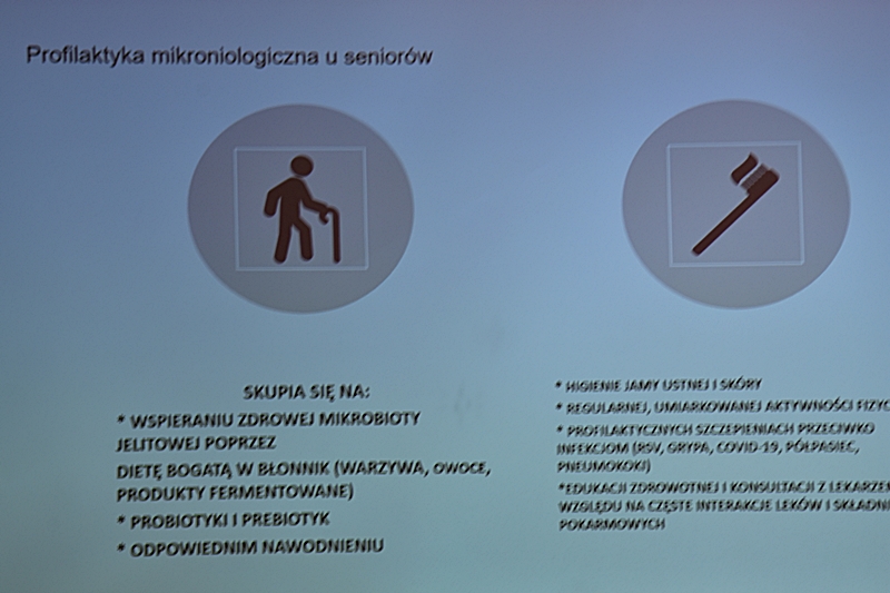 1.Zdrowie seniorów staje się coraz ważniejszym tematem w obliczu starzejącego się społeczeństwa. Osoby starsze, często zmagające się z różnymi schorzeniami, wymagają szczególnej uwagi w zakresie edukacjizwiązanej z profilaktyką zdrowotną, dietą oraz aktywnością fizyczną. 2. Starzenie się nie jest chorobą, ale zachodzące zmiany fizjologiczne eksponują osoby starsze na wysokie ryzyko zakażeń (bakteryjnych, wirusowych, grzybiczychoraz pasożytniczych, które są główną przyczyną hospitalizacji i zgonów w tej populacji osób. 3. Według danych Głównego Urzędu Statystycznego w Polsce liczba osób w wieku 65 lat i starszych wzrośnie o około 8 milionów (21%) w 2025 roku do 10,8 miliona, w 2030 roku, co oznacza, że w ciągu najbliższych dwóch dekat ten odsetek wzrośnie o 3,9%. 4. Profilaktyka mikrobiologiczna u seniorów skupia się na:wspieraniu zdrowej mikrobioty jelitowej poprzez dietę bogatą w błonnik – warzywa, owoce, produkty fermentowane; probiotyki, prebiotyki; odpowiednim nawodnieniu; higienie jamy ustnej i skóry;regularnej, umiarkowanej aktywności fizycznej; profilaktycznych szczepieniach przeciwko infekcjom (RSV, grypa,covid-19, półpasiec, pneumokoki); edukacji zdrowotnej i konsultacji z lekarzem, ze względu na częste interakcje leków i składników pokarmowych. 5. Zwiększa się ilość potencjalnie patogennych drobnoustrojów, które prowadzą do stanu zwanego dysbiozą, co wpływa na osłabienie odporności, metabolizmu i funkcji poznawczych. Dieta bogata w błonnik, prebiotyki/probiotyki i kwasy omega-3 spowolniają procesy starzenia i poprawią jakość życia. W podeszłym wieku dużym wyzwaniem staje się wielolekowość, czyli jednoczesne stosowanie wielu preparatów. Każdy lek wpływa na mikroflorę jelitową. Cechy mikrobioty u seniorów: a) zmniejszona bioróżnorodność-mniej różnych gatunków bakterii, w tym Lactobacillus spp, Bifidobacterium spp, które wytwarzają kwas mlekowy, uniemożliwiający rozwój bakterii patogennych; b) spadek bakterii produkujących krótkołańcuchowe kwasy tłuszczowe (octan, propionian, maślan) mniejFaecalibacterium prausnitzii,które odżywiają nabłonek jelit (fermentacja bakteryjna błonnika); c)wzrost bakterii chorobotwórczych: zwiększa się ilość Enterococcus spp i Escherichia coli, co sprzyja stanom zapalnym; d) dysbioza: zaburzenie równowagi między bakteriami prozdrowotnymi a patogennymi (proteolitycznymi) co prowadzi do powstania metanu oraz amin biogennych działających hepatotoksycznie. Jak wspierać mikrobiotę w starszym wieku- węglowodany złożone (kasze, pieczywo pełnoziarniste), warzywa, owoce, zdrowe tłuszcze (kwasy omega-3), probiotyki i prebiotyki: suplementacja może pomóc w odbudowie równowagi-styl życia: aktywność fizyczna, odpowiednia jakość snu, unikanie alkoholu i niepotrzebnych leków. Probiotyki to żywe mikroorganizmy (głównie bakterie), które po przyjęciu w odpowiedniej ilości mogą wspierać zdrowie jelit. Prebiotyki to niestrawne włókna pokarmowe, którestanowią „pożywienie” dla dobrych bakterii jelitowych- pomagają im rosnąć i funkcjonować. Synbiotyk to preparat łączący w jednej kapsułce probiotyk z prebiotykiem. Seniorzy są grupą szczególnie narażoną na zaburzenia mikrobioty jelitowej ze względu na wiek, stosowane leki i zmiany w diecie. GIS przypomina, że suplementy diety nie podlegają tak restrykcyjnym badaniom klinicznym jak leki. Przed zakupem warto sprawdzić produkt w Rejestrze Produktów GIS, aby upewnić się, że został zgłoszony do obrotu. Skuteczność probiotyku zależyod konkretnego szczepu (np. Lactobacillus rhamnous GG). Seniorzy powinni szukać preparatów z pełną, trójczłonową nazwą szczepu na opakowaniu. 6. Higiena jamy ustnej. Zaniedbanie higieny jamy ustnej może prowadzić do próchnicy, chorób dziąseł, stanów zapalnych oraz utraty zębów. Nieleczone infekcje w jamie ustnej mogą stać się źródłem bakterii, które przedostają się do krwiobiegu i zwiększają ryzyko chorób serca, zapalenia płuc czy zaostrzenia cukrzycy. Ból zębów i nieświeży oddech mogą powodować trudności w jedzeniu, co sprzyja niedożywieniu, a także prowadzić do izolacji społecznej i obniżonej samooceny. 7. Higiena skóry. Zaniedbanie higieny skóry może skutkować jej przesuszeniem, pękaniem naskórka, podrażnieniami oraz rozwojem infekcji bakteryjnych i grzybiczych. U osób o ograniczonej mobilności brak odpowiedniej pielęgnacji zwiększa ryzyko powstawania odleżyn, które są bolesne i trudne w leczeniu. Niwłaściwa higiena sprzyja nieprzyjemnemu zapachowi ciała, co może prowadzić do poczucia wstydu, wycofania się z kontaktów z innymi ludźmi oraz pogorszenia stanu psychcznego. 8. Szczepienia ochronne u osób starszych mają ogromne znaczenie, ponieważ wraz z wiekiem układ odpornościowy stopniowo słabnie. Zjawisko to, nazywane immunosenescencją sprawia, że seniorzy są bardziej podatni na zakażenia, cięższy przebieg chorób oraz groźne powikłania, takie jak zapalenie płuc, niwydolność oddechowa, zaostrzenie chorób przewlekłych, czy nawet zgon.Szczepienia nie tylko zmniejszają ryzyko zachorowania, ale przede wszystkim chronią przed ciężkim przebiegiem choroby, hospitalizacją i utratą samodzielności, co w starszym wieku ma kluczowe znaczenie dla jakośści życia. Warto podkreślić, że wiele chorób zakaźnych, które u młodszych osób mają łagodny przebieg, u seniorów może prowadzić do bardzo poważnych konsekwencji. Przykładem jest grypa, która u osób starszych często kończy się zapaleniem płuc lub niewydolnością krążeniowo-oddechową, oraz COVID-19, który szczególnie zagraża osobom z chorobami współistniejącymi. Szczepienia pomagają także chronić osoby z otoczenia seniora, w tym współmałżonków czy wnuki, ograniczając roprzestrzenianie się chorób zakaźnych. Zanidbanie szczepień u osób starszych może prowad