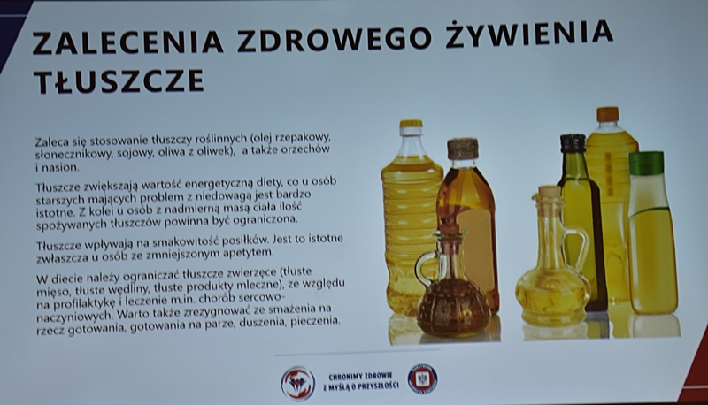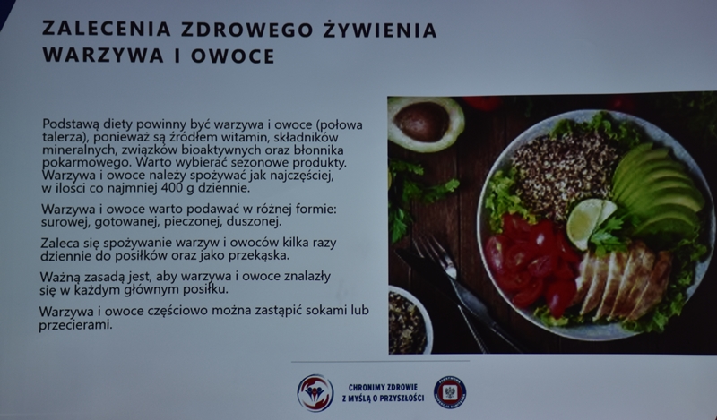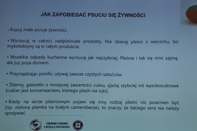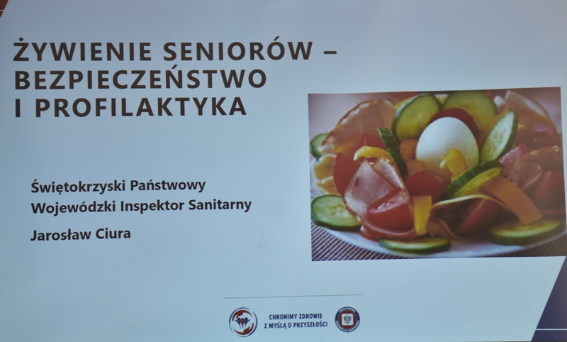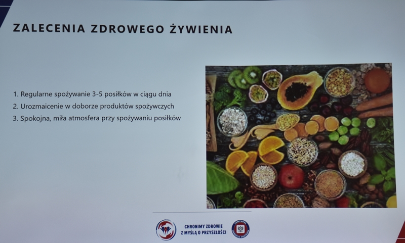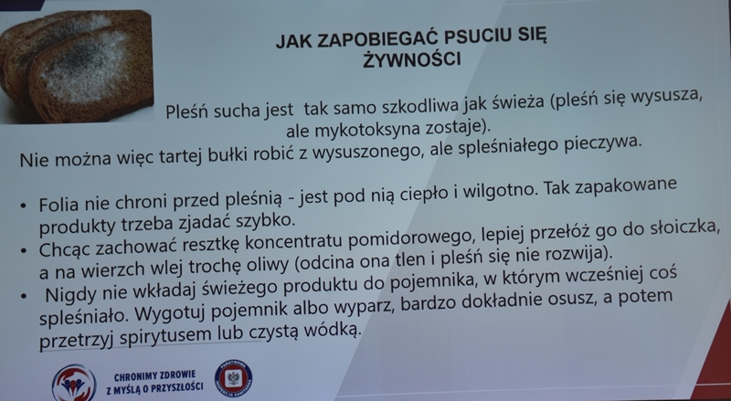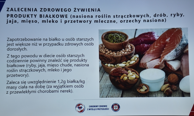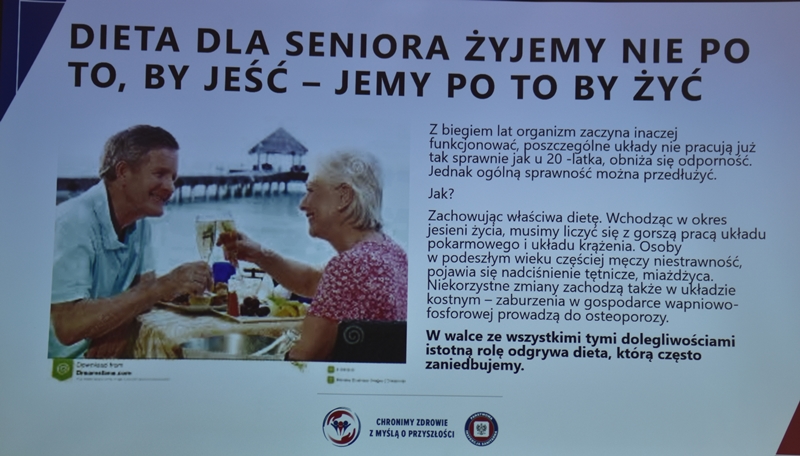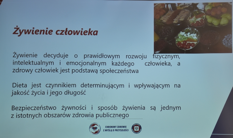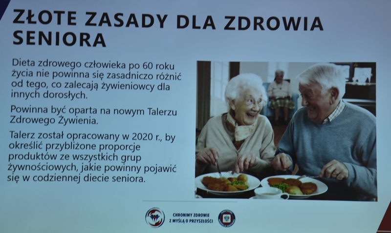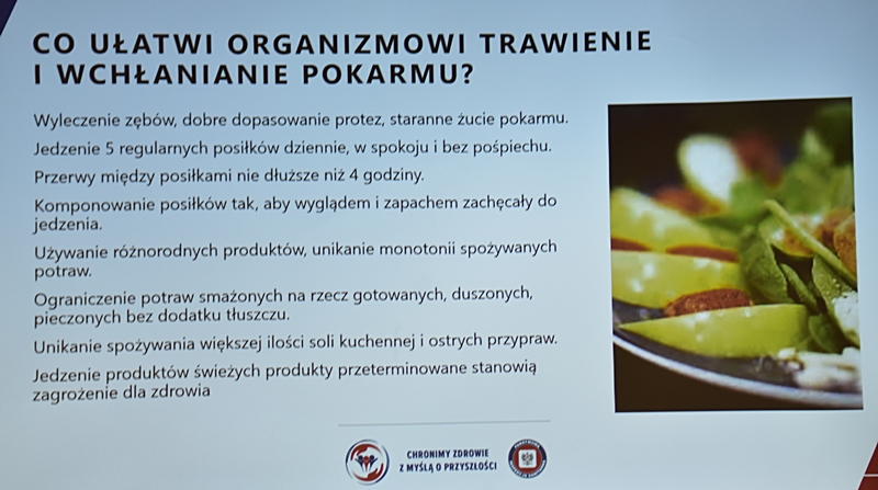 Żywienie człowieka. Tu ważne jest, aby posiłek spożywać w towarzystwie innych osób.Choroby przenoszone drogą pokarmową-tu istotne jest co jemy i jak przebiegała obróbka termiczna. Pleśń w żywności – toksyczne są związki wydzielane przez pleśń. Każdy produkt zaatakowany przez pleśń trzeba wyrzucić w całości. Pleśń w owocach – patulina to toksyna powstająca na owocach zaatakowanych przez pleśń. Patulina powoduje zatrucia pokarmowe, wrzody i krwawienia. Jak zapobiegać psuciu się żywności? Nie kupować w nadmiarze, zwracać uwagę na etykiety, otwarty produkt zabezpieczyć przed dopływem tlenu. Dieta dla seniora – ważne jest prawidłowe odżywianie, gdyż z wiekiem spada odporność, pojawiają się choroby np. nadciśnienie, osteoporoza. Złote zasady dla zdrowia seniora: dieta powinna być oparta na Talerzu Zdrowego Żywienia. Zalecenia zdrowego żywienia: Spożywać produkty zbożowe, pełnoziarniste, warzywa, owoce, rośliny strączkowe. Ryby, nabiał, orzechy, mało mięsa czerwonego i soli. 3-5 urozmaiconych posiłków w ciągu dnia spożytych w miłej atmosferze. Warzywa i owoce co najmniej 400g dziennie. Jedna czwarta talerza to produkty zbożowe. Suplementy diety np. wit. D3 stosować po uprzednim zbadaniu jej poziomu w organizmie. Produkty białkowe ryby, jaja mięso, przetwory mleczne – przyjmuje się 1,2g /kg masy ciała. Mięso lepiej ugotować i udusić niż piec i smażyć. Ryby spożywać 2 razy tygodniowo, lepiej wybierać ryby morskie, niż hodowlane. Produkty mleczne najlepiej spożywać 3 szkl dziennie, warto jeść kefir, maślankę, sery twarogowe. Rośliny strączkowe jako źródła witamin B. Orzechy to niewielki dodatek np. mała garść dziennie. Tłuszcze - zaleca się stosowanie tłuszczów roślinnych. Ograniczenie soli do 5g dziennie (1 płaska łyżeczka). Woda, zaleca się8 szklanek dziennie. Aktywność fizyczna dostosowana do stanu zdrowia. Co ułatwi organizmowi trawienie i wchłanianie? wyleczenie zębów, dopasowanie protez. 5 posiłków dziennie. Przerwy między posiłkami nie dłuższe niż 4 godz. Zmieniać dietę, urozmaicać, unikać soli i ostrych przypraw.