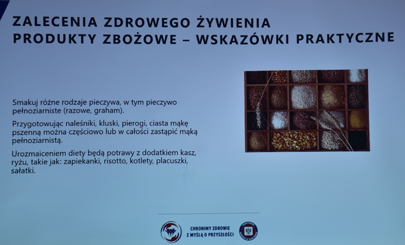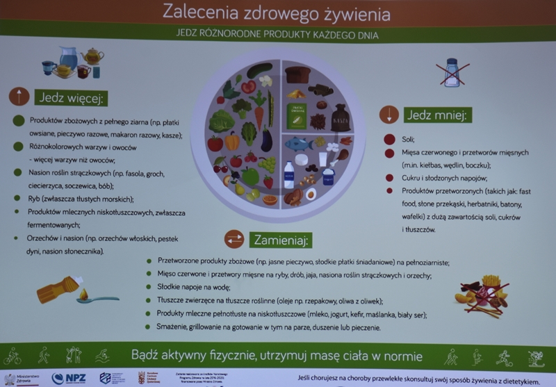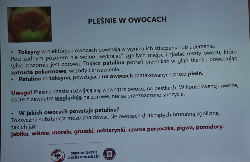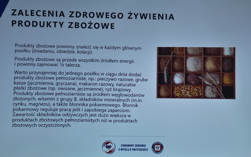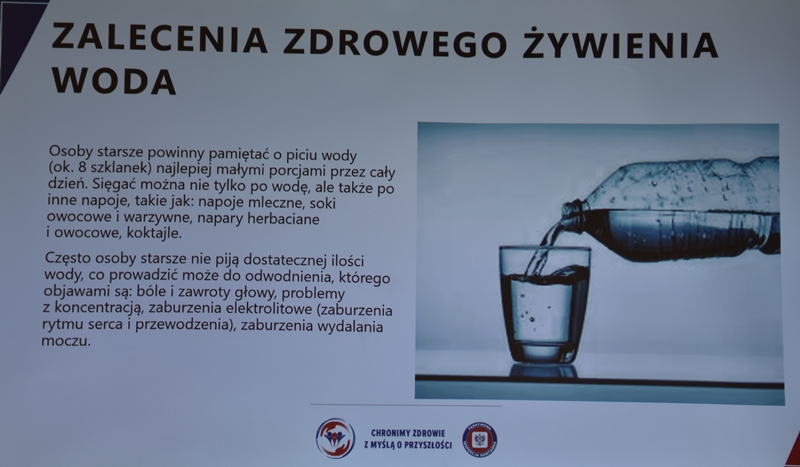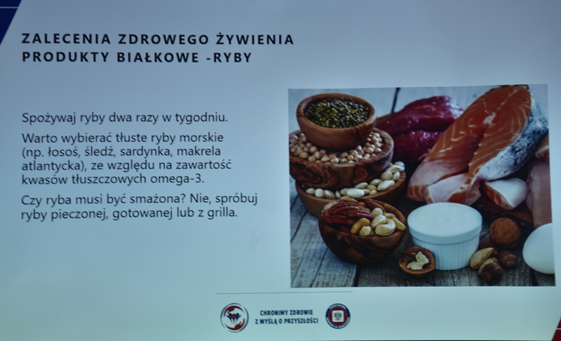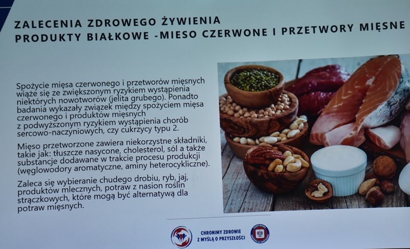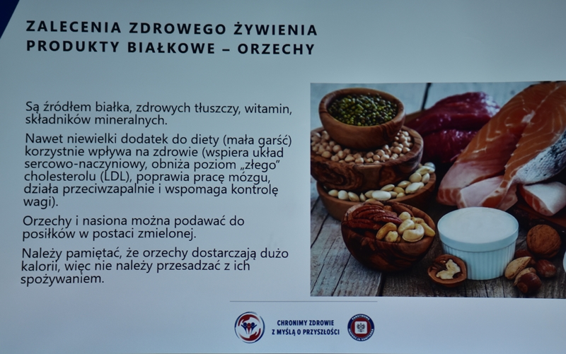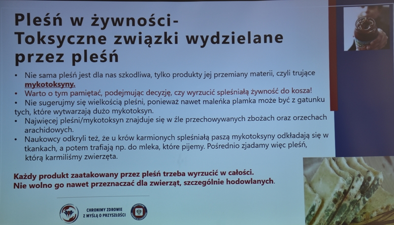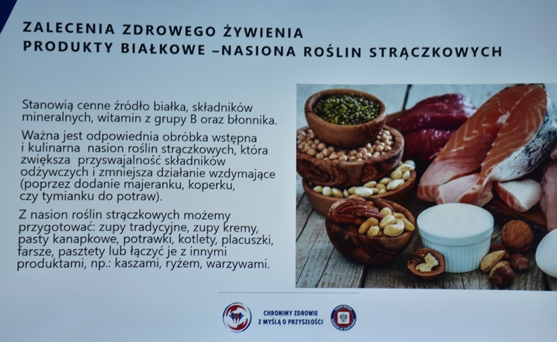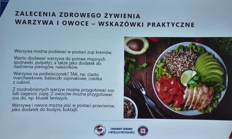 Żywienie człowieka. Tu ważne jest, aby posiłek spożywać w towarzystwie innych osób.Choroby przenoszone drogą pokarmową-tu istotne jest co jemy i jak przebiegała obróbka termiczna. Pleśń w żywności – toksyczne są związki wydzielane przez pleśń. Każdy produkt zaatakowany przez pleśń trzeba wyrzucić w całości. Pleśń w owocach – patulina to toksyna powstająca na owocach zaatakowanych przez pleśń. Patulina powoduje zatrucia pokarmowe, wrzody i krwawienia. Jak zapobiegać psuciu się żywności? Nie kupować w nadmiarze, zwracać uwagę na etykiety, otwarty produkt zabezpieczyć przed dopływem tlenu. Dieta dla seniora – ważne jest prawidłowe odżywianie, gdyż z wiekiem spada odporność, pojawiają się choroby np. nadciśnienie, osteoporoza. Złote zasady dla zdrowia seniora: dieta powinna być oparta na Talerzu Zdrowego Żywienia. Zalecenia zdrowego żywienia: Spożywać produkty zbożowe, pełnoziarniste, warzywa, owoce, rośliny strączkowe. Ryby, nabiał, orzechy, mało mięsa czerwonego i soli. 3-5 urozmaiconych posiłków w ciągu dnia spożytych w miłej atmosferze. Warzywa i owoce co najmniej 400g dziennie. Jedna czwarta talerza to produkty zbożowe. Suplementy diety np. wit. D3 stosować po uprzednim zbadaniu jej poziomu w organizmie. Produkty białkowe ryby, jaja mięso, przetwory mleczne – przyjmuje się 1,2g /kg masy ciała. Mięso lepiej ugotować i udusić niż piec i smażyć. Ryby spożywać 2 razy tygodniowo, lepiej wybierać ryby morskie, niż hodowlane. Produkty mleczne najlepiej spożywać 3 szkl dziennie, warto jeść kefir, maślankę, sery twarogowe. Rośliny strączkowe jako źródła witamin B. Orzechy to niewielki dodatek np. mała garść dziennie. Tłuszcze - zaleca się stosowanie tłuszczów roślinnych. Ograniczenie soli do 5g dziennie (1 płaska łyżeczka). Woda, zaleca się8 szklanek dziennie. Aktywność fizyczna dostosowana do stanu zdrowia. Co ułatwi organizmowi trawienie i wchłanianie? wyleczenie zębów, dopasowanie protez. 5 posiłków dziennie. Przerwy między posiłkami nie dłuższe niż 4 godz. Zmieniać dietę, urozmaicać, unikać soli i ostrych przypraw.