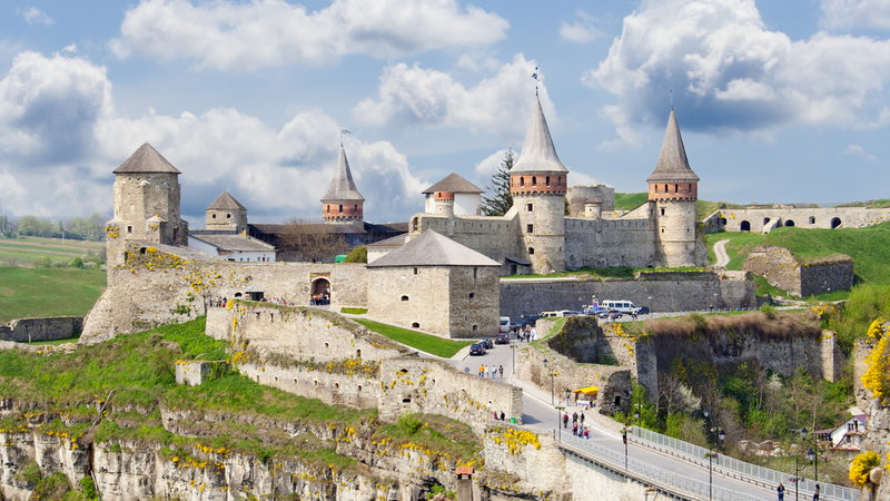 Kamieniec Podolski. Na kamienistych zboczach wznoszą się potężne ściany i wieże starego miasta,
