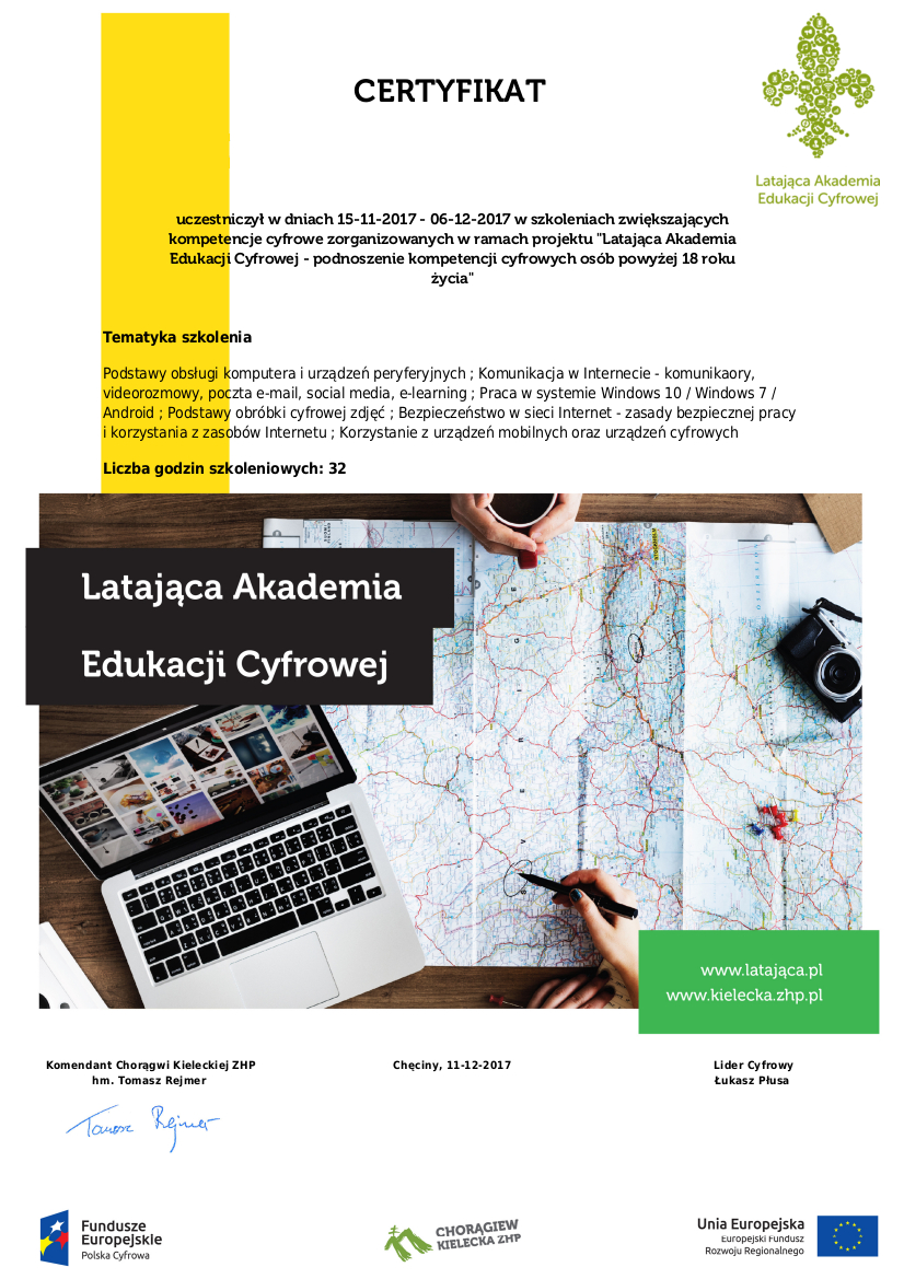 W dniu 11.12.2017 roku pierwsza grupa słuchaczy 65+ zakończyła szkolenie zorganizowane w ramach projektu „Latająca Akademia Edukacji Cyfrowej – podnoszenie kompetencji cyfrowych osób powyżej 18 roku życia”.