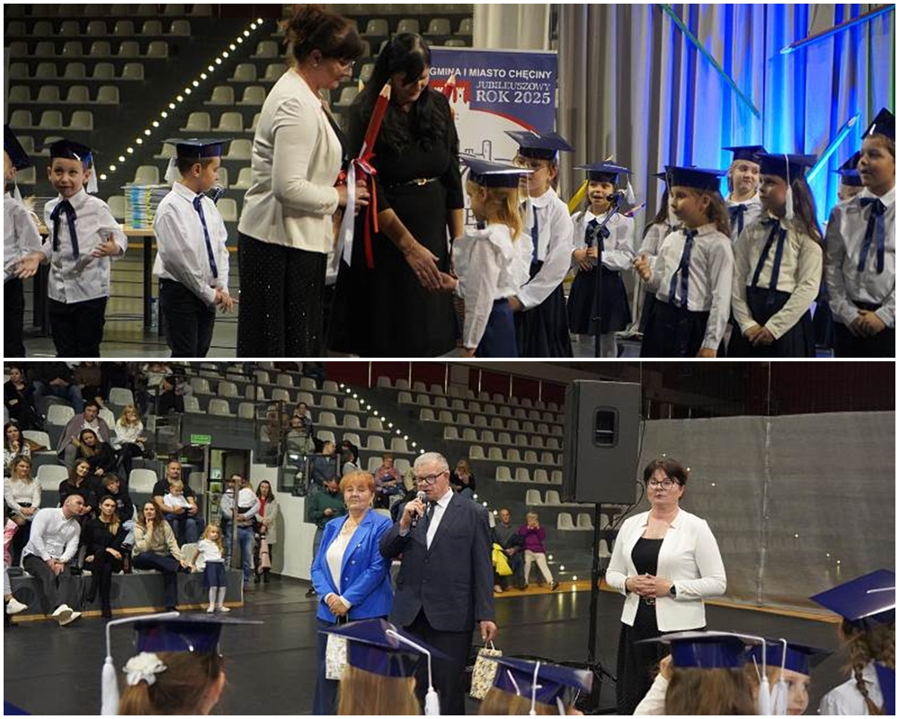 W uroczystości wzięli udział burmistrz Gminy i Miasta Chęciny Robert Jaworski, radni Rady Miejskiej Krzysztof Kasiński, Mariusz Ponikowski oraz Zdzisław Treliński, przedstawiciele Uniwersytetu Trzeciego Wieku a także rodzice, dziadkowie i cała społeczność szkolna. Pierwszoklasiści w odświętnych strojach zaprezentowali program artystyczny pełen wierszy, piosenek i tańców, który wspaniale ukazał ich talent, zaangażowanie i radość z bycia częścią szkolnej społeczności. Następnie złożyli uroczyste ślubowanie na sztandar szkoły, po czym dyrektor szkoły dokonała symbolicznego pasowania na ucznia. Na koniec uroczystości otrzymali gratulacje i prezenty. Wychowawczynie klas pierwszych: Grażyna Metrycka, Sylwia Mielczarz, Katarzyna Terelak oraz Karolina Kowalska.