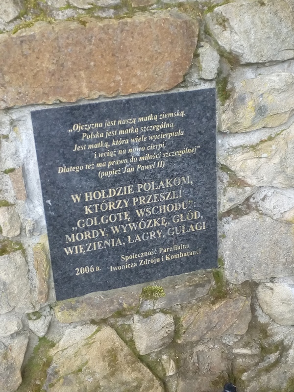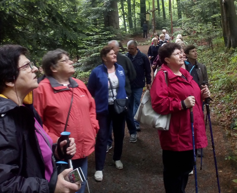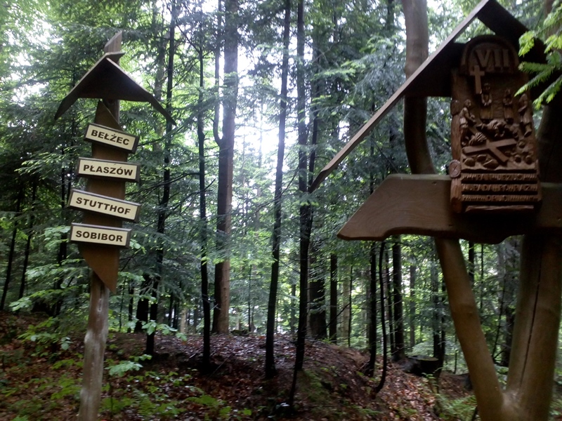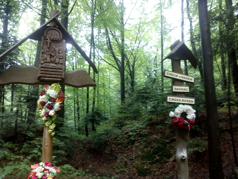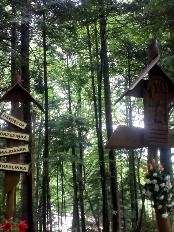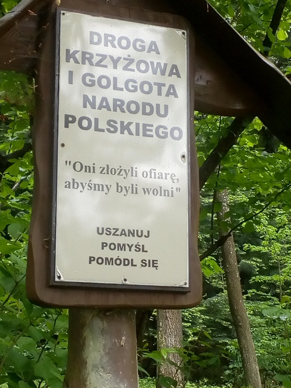 Poszliśmy leśną ścieżką zatrzymując się przy stacjach drogi krzyżowej, przy obeliskach i tablicach upamiętniających ofiary terroru: hitlerowskiego, stalinowskiego, II wojny światowej, stanu wojennego. Zatrzymaliśmy się przy symbolicznej mogile i krzyżu ofiar katastrofy smoleńskiej.