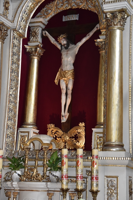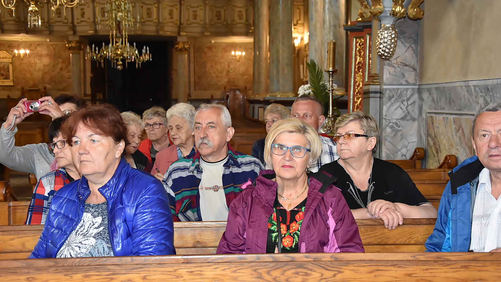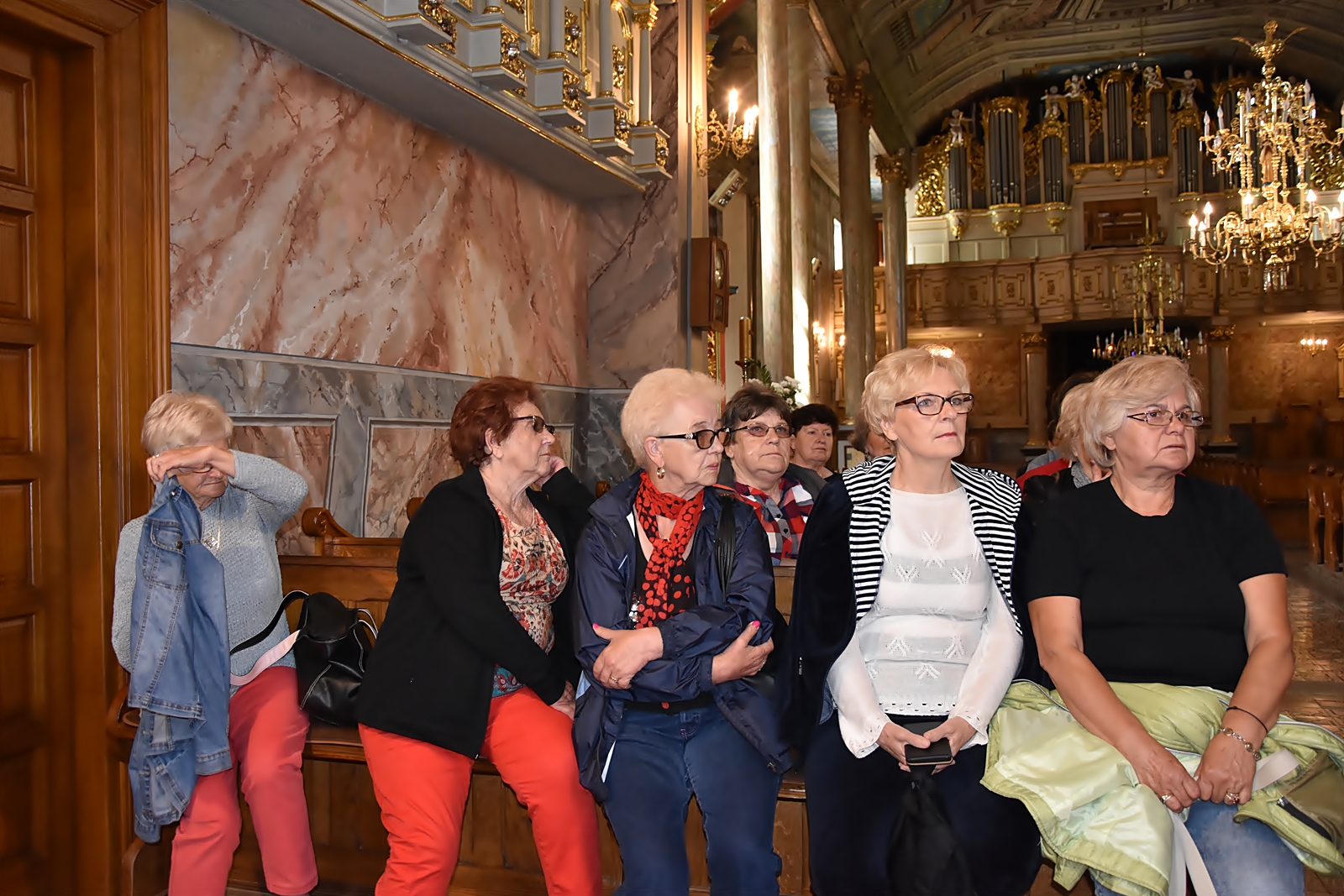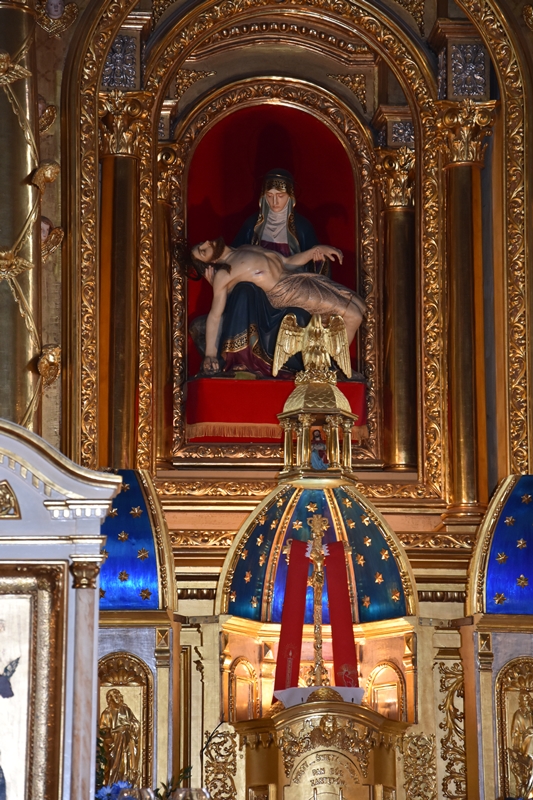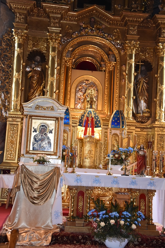 W centralnej części Matka Boska Anielska w odsłonie przepiękna Pieta. Po obu stronach rzeźby św. Piotra i Pawła. Na ołtarzach bocznych są rzeźby i płaskorzeźby Józefa Aszklara z lat 1885 – 1895. Po przebudowie przeniesiono stary ołtarz główny z XV wieku oraz organy do bocznej kaplicy Matki Boskiej Bolesnej. Obejście świątyni zdobią kamienne rzeźby Józefa Aszklara. Rzeźby i malowidła pozostawiły w naszej pamięci niezapomniane wrażenia. Dopisała piękna pogoda, pani przewodnik przekazała nam dużo ciekawych i ważnych informacji.