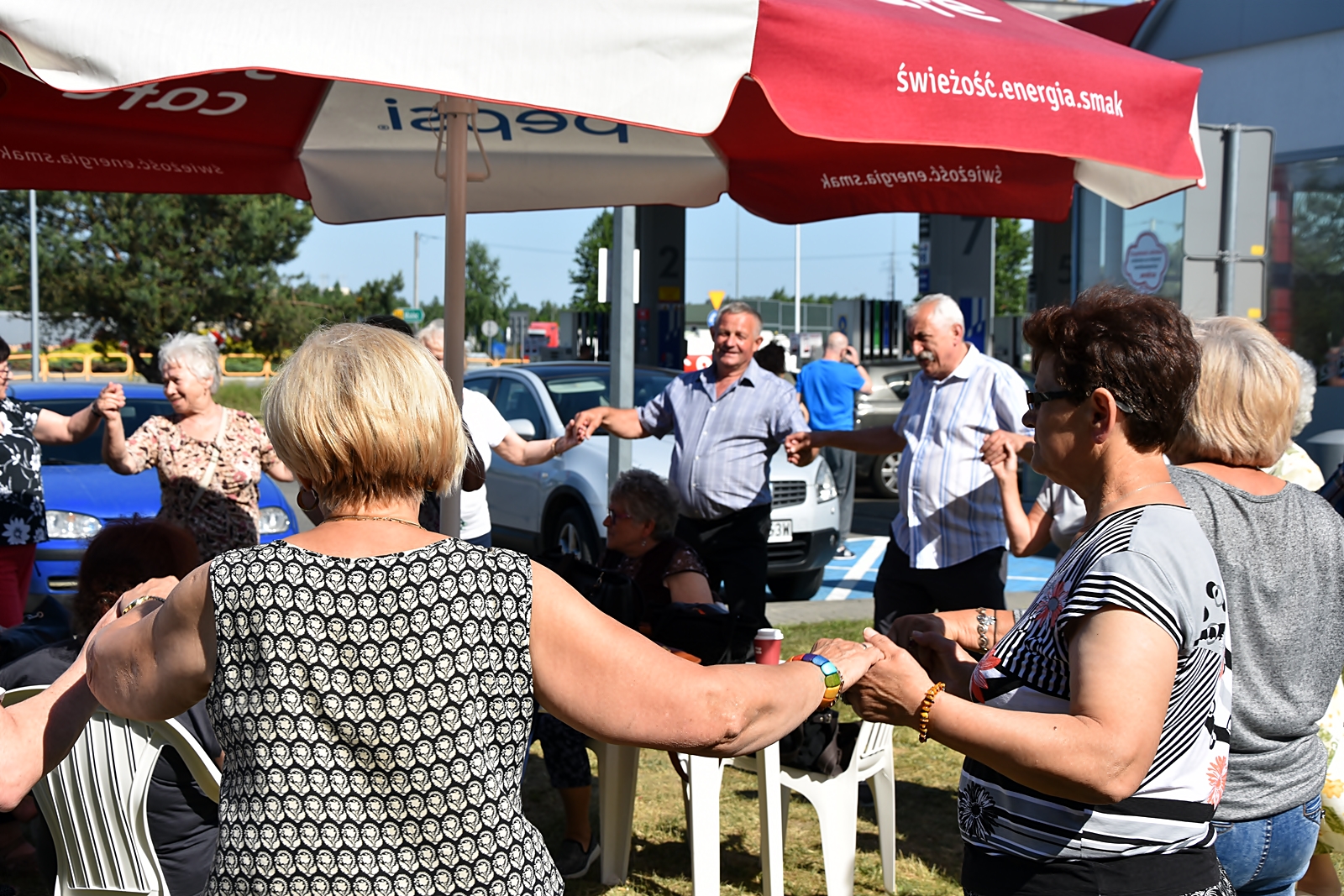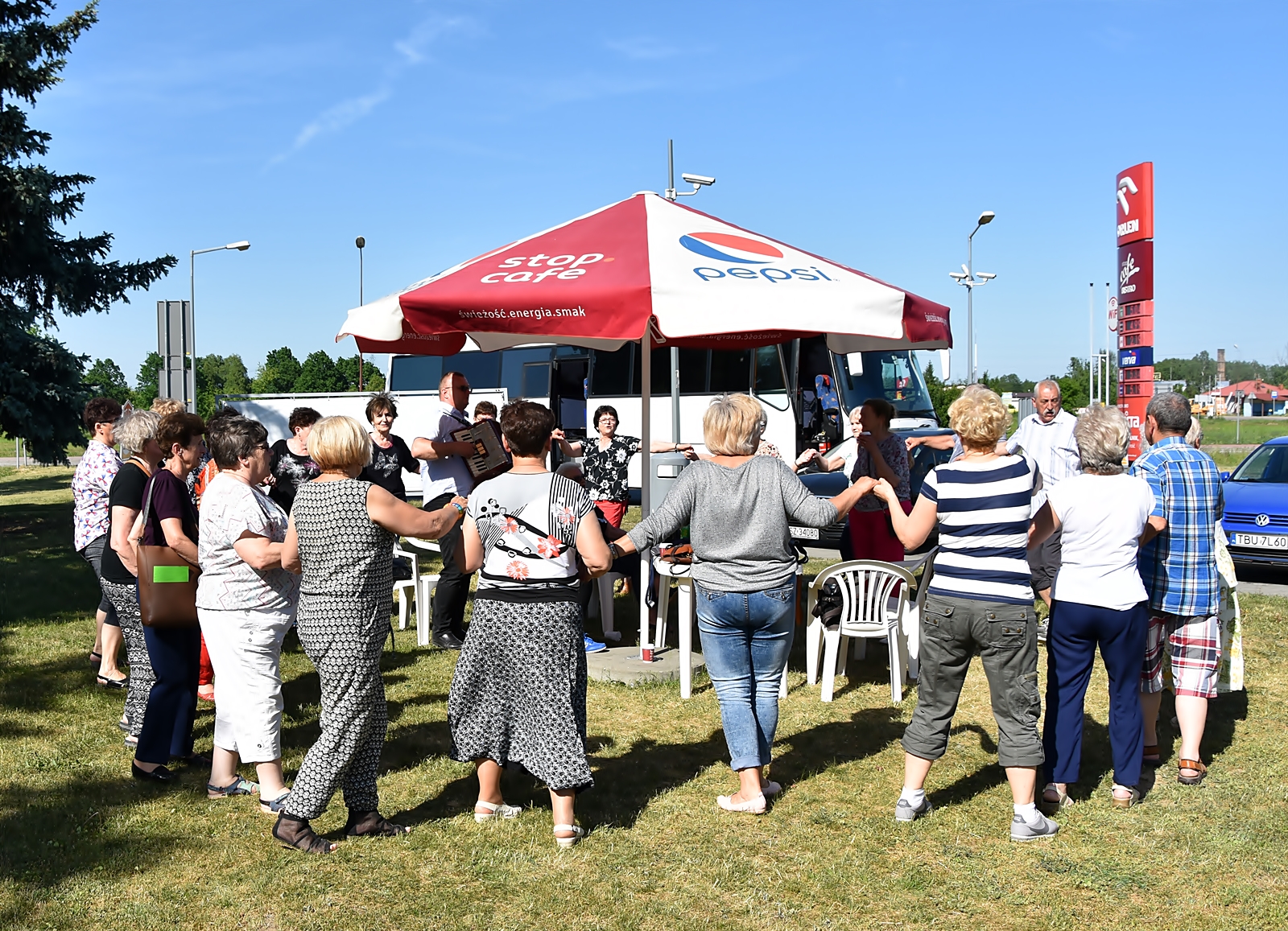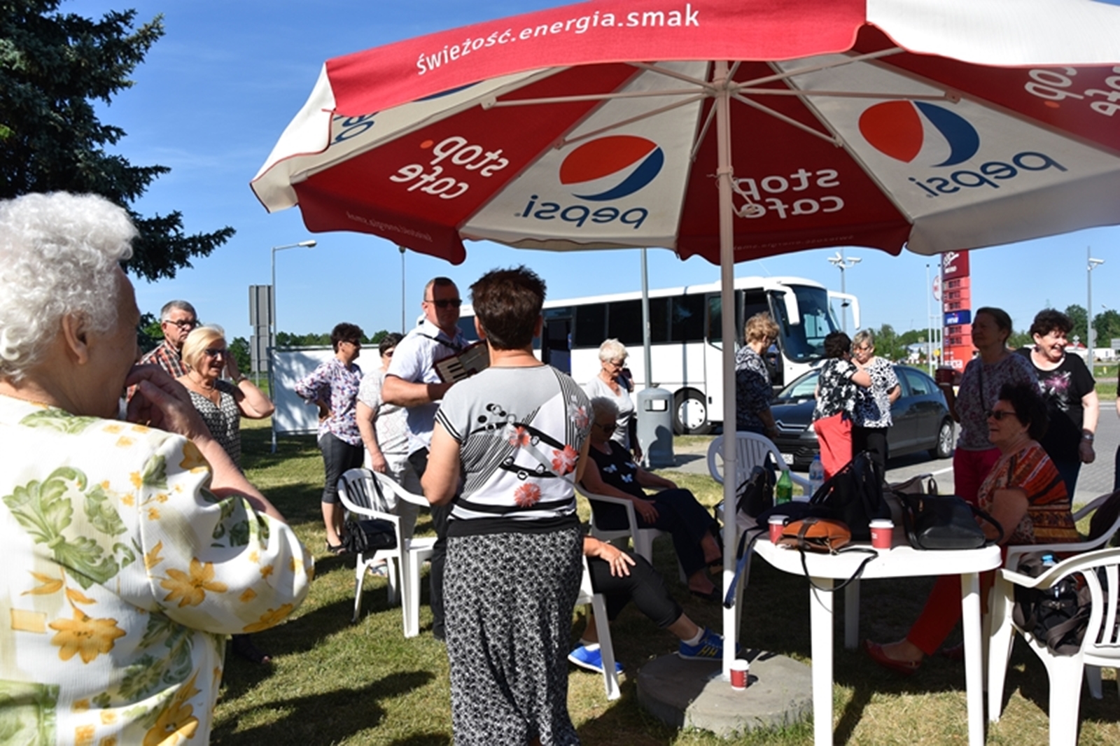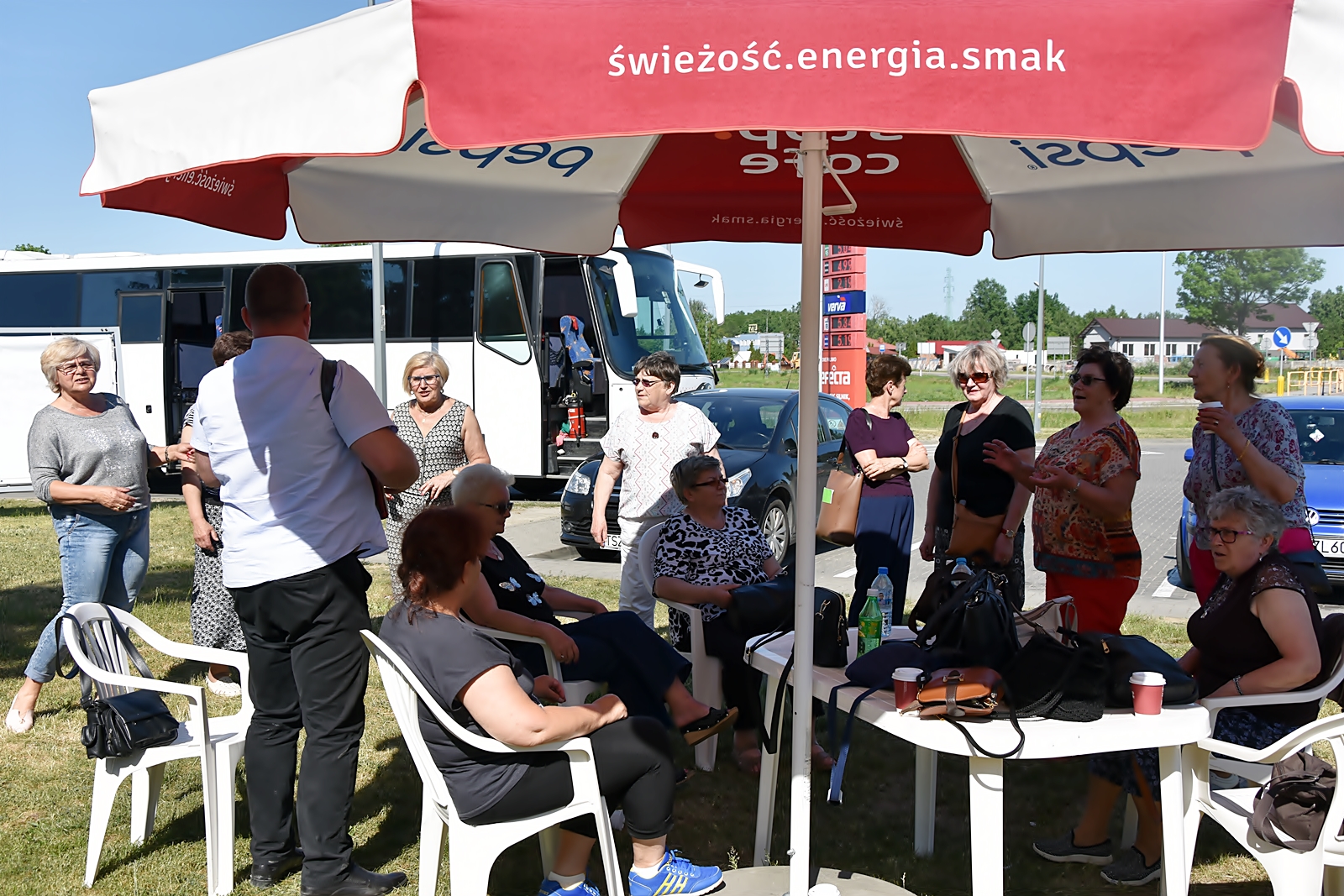 Zatrzymaliśmy się w Krośnie w sklepie firmowym Krośnieńskiej Huty Szkła. Wszyscy dokonaliśmy udanych zakupów. Radości było co niemiara. Po godzinie 13 dotarliśmy do Robczyc, gdzie w restauracji Malaga zjedliśmy smaczny i obfity obiad. Po krótkim spacerze pojechaliśmy dalej. Na następny odpoczynek zatrzymaliśmy się na stacji benzynowej w Połańcu.