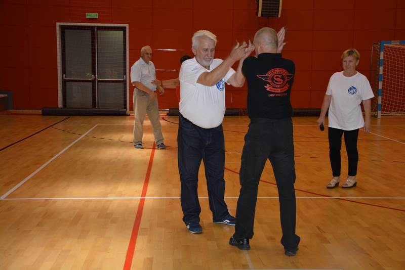 w Kielcach omówił i praktycznie przećwiczył z seniorami sposoby samoobrony.