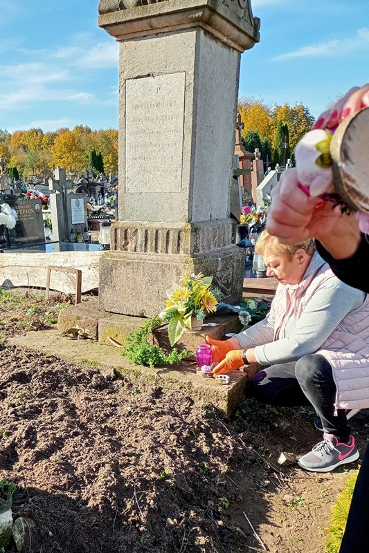 Każdego roku Wolontariusze z Chęcińskiego Uniwersytetu Trzeciego Wieku spotykają się na Cmentarzu Parafialnym w Chęcinach, aby uporządkować zapomniane mogiły z XVIII wieku. To już nasza tradycja, Kilka dni przed Świętem Zmarłych, zaopatrzeni w worki na śmieci, sekatory, wiadra i inne rzeczy potrzebne przy sprzątaniu, zaczynamy swoją pracę. Wycinamy duże chwasty, gałęzie, wyrywamy trawy i zbieramy wypalone znicze. Zupełnie inaczej wyglądają te pomniki po naszym pobycie. Chociaż praca z szarpaniem się z ogromnymi zaroślami nie należy do lekkich, to później satysfakcja duża. Czyste pomniki i uporządkowany wokół nich teren, to sygnał, że jest ktoś, kto pamięta i zawsze zapali skromny znicz. Również grupa Rękodzieła przygotowała wiązanki i małe stroiki, które złożyliśmy przy pomnikach. Przechodząc obok opuszczonych mogił zapalmy choć maleńkie, ale symboliczne światło pamięci. Kiedyś nas też nie będzie i może ktoś przechodząc zapali lampkę, zostawiając znak, że o nas pamięta.. Dziękujemy wszystkim osobom - zarówno z grupy Wolontariat, jak i Rękodzieła za poświęcony czas. To nic nie kosztuje , a spełnimy dobry uczynek.