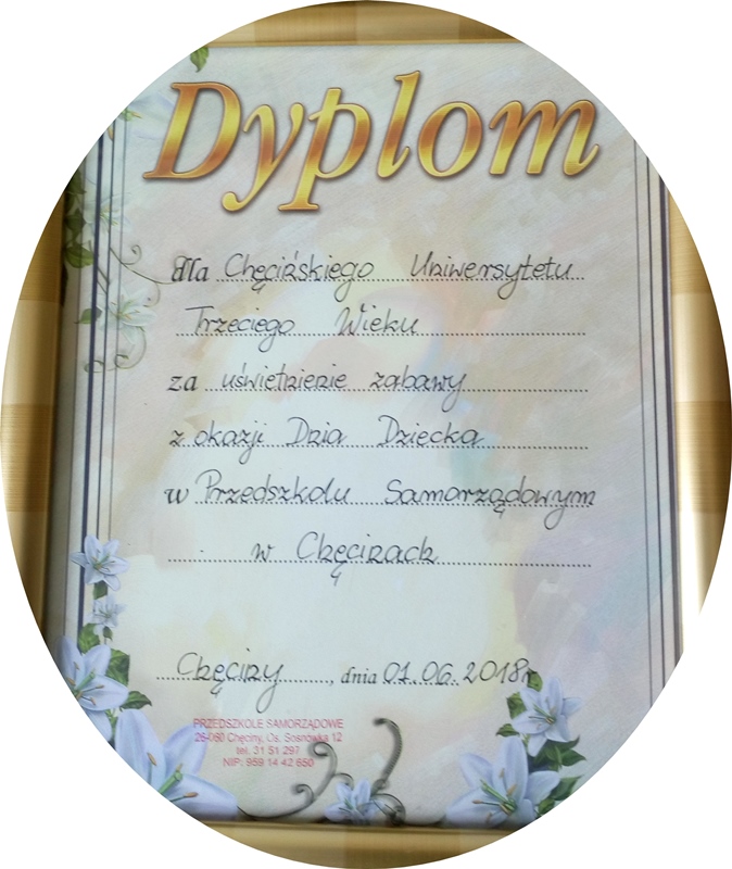 W słoneczny poranek dnia 1 czerwca 2018 roku, delegacja Uniwersytetu Trzeciego Wieku, w składzie: Zenona Dołęgowska, Grażyna Tkacz, Marian Wroński odwiedziła dzieci z Przedszkola Samorządowego w Chęcinach i obdarowała upominkami, z okazji Święta Dnia Dziecka.