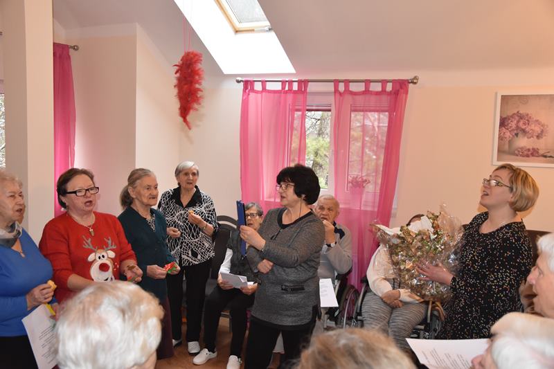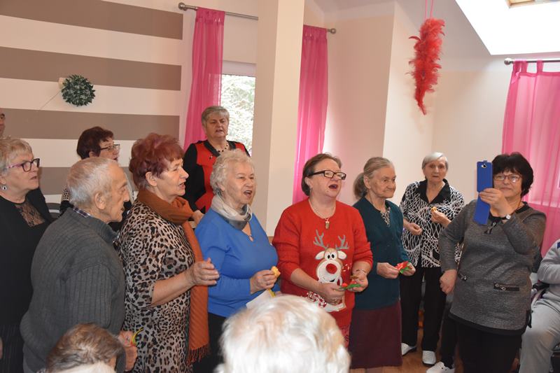 Przedświąteczne wizyty wiążą się przeważnie z kolędami. Część naszej grupy to przedstawiciele chóru „Jesienna sonata”. Kol. Wanda przygotowała zbiór kolęd z powiększonym drukiem i rozdała wszystkim osobom. Po chwili w budynku rozległ się wspaniały śpiew naszych chórzystów i pensjonariuszy. Okazało się, że Ci starsi, schorowani ludzie śpiewali bez tekstów, pamiętali doskonale słowa kolęd. Męskie głosy Stasia i Janusza dodawały szczególnego uroku a koleżanki Helenka , Gosia i Wiesia pomagały chłopakom