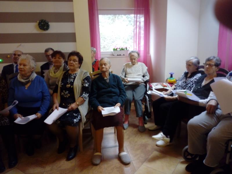 Przywitała nas Pani Kierownik i zaprowadziła do oczekujących w świetlicy pensjonariuszy. Ponieważ część z nich jest leżąca spotkaliśmy się z grupą około 20 kilku osób. W związku ze zbliżającymi się Świętami Bożego Narodzenia pragnęliśmy wnieść chociaż odrobinę radościi wywołać nawet maleńki uśmiech na ich twarzach.
