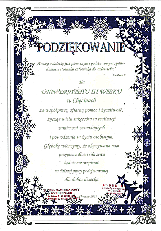 Podziękowanie za współpracę, pomoc i życzliwość dla członków Chęcińskiego Uniwersytetu Trzeciego Wieku od Pracowników Żłobka w Chęcinach.