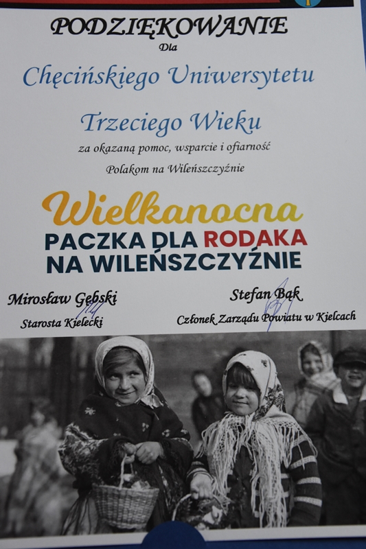 Następnie samorządowcy odwiedzili polskie rodziny przekazując prawie 2 tony produktów z długim terminem ważności oraz środki czystości, które kieleckie starostwo oraz jednostki organizacyjne powiatu zebrały w ramach koleżeńskiej zbiórki przeprowadzonej z inicjatywy starosty kieleckiego Mirosława Gębskiego. -Tekst Poprzednia zbiórka odbyła się w Boże Narodzenie, zebrano około tony żywności i środków chemicznych. W tej edycji zebraliśmy prawie 2 tony produktów, które trafiły do rejonu solecznickiego. Jest to jedyny na świecie samorząd, którym rządzą nasi rodacy. Na początku marca odbyły się wybory samorządowe. Zdzisław Palewicz zdobył prawie 82% głosów w radzie rejonu solecznickiego. Z każdą naszą wizytą polskie rodziny bardzo się cieszą, jak to mówi Tadeusz Romanowski - wielka Polska pamięta o małej Polsce. Powinniśmy pamiętać, że oni Polski nie opuścili, to Polska opuściła tamte tereny decyzją wielkich mocarstw, które przesunęły naszą granicę. Około 80% zamieszkałych to Polacy, stąd też wyniki w wyborach. Jeszcze raz serdecznie dziękujemy za zaangażowanie się w akcję - mówił starosta kielecki Mirosław Gębski. Produkty trafiły między innymi do Polaków zgromadzonych wokół Wspólnoty Miłosierdzia Bożego w Solecznikach, której prezesem jest Tadeusz Romanowski. Paczki przekazano dwa tygodnie przed świętami. Symboliczne podziękowania wręczono wszystkim zaangażowanym w akcję „Wielkanocna Paczka dla Rodaka na Wileńszczyźnie”.- Dzięki wam akcja się udała. Warto pomagać Polakom na Litwie opuszczonym, zostawionym żyjącym w bardzo ciężkich nieraz skrajnych warunkach. Akcja jest symbolem, że Polska pamięta o rodakach zostawionych na kresach. W ciężkich warunkach żyją również dzieci. W Solecznikach stworzone są lepsze warunki dzięki rządowi polskiemu - wybudowana szkoła z internatem. Mamy nadzieję, że tym dzieciom normalne warunki sprzyjają w edukacji, a później studiują również na terenie Polski - dodał członek Zarządu Powiatu w Kielcach Stefan Bąk. W przygotowaniu pomocy uczestniczyli słuchacze Chęcińskiego Uniwersytetu Trzeciego Wieku.
