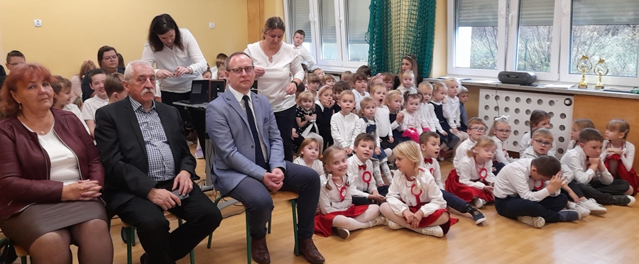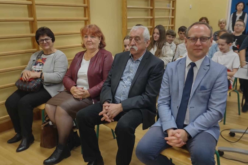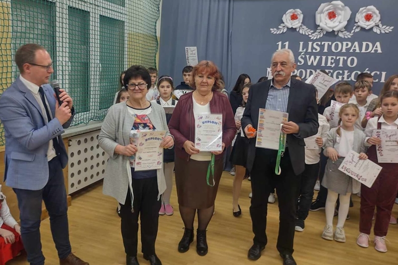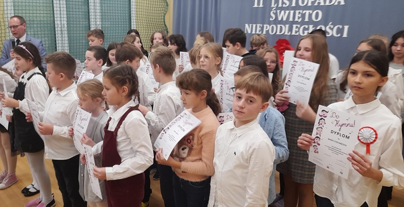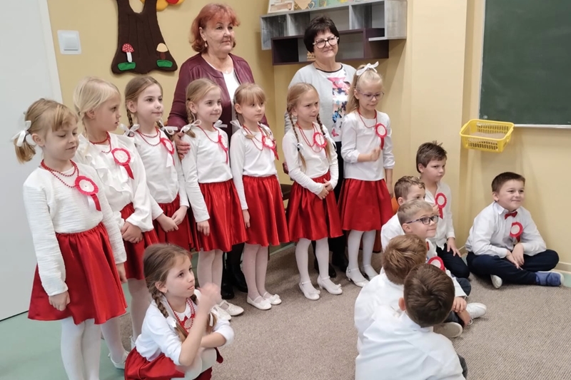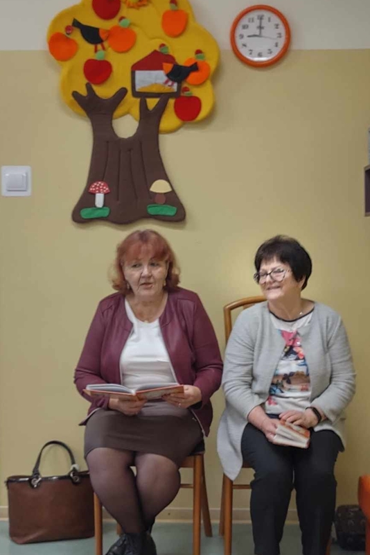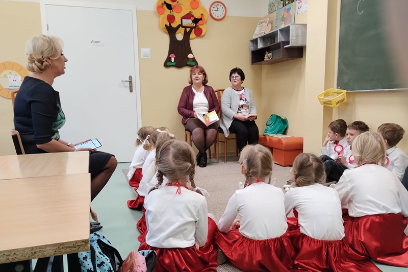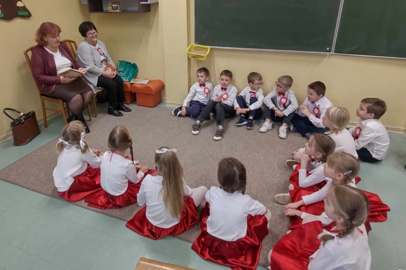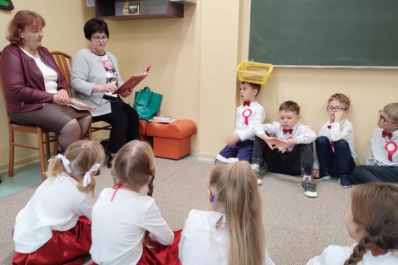 Koleżanka Ela czytała wiersze Marii Konopnickiej "Kto ty jesteś". Dzieci świetnie ten wiersz znały i bezbłędnie odpowiadały na pytania. Wiersz "Stefek Burczymucha ", też był dzieciom znany i bardzo lubiany. Ja przygotowałam książeczkę "Rechotek" Rafała Wejnera o żabce chwalipięcie, która została bohaterem. Z książki Wierszolandia wiersz "O tym jak turyści mali pożar w lesie wywołali, była to rymowanka o ochronie środowiska i zachowaniu się dzieci w lesie. Tu było miłe zaskoczenie dzieci z pierwszej klasy doskonale wiedzą, jak się zachowywać na spacerach, czy wycieczce w lesie. Niektóre dzieci biorą udział w sprzątaniu nie tylko świata, ale opowiadały, że z rodzicami zbierają śmieci. W domu segregują śmieci i wiedzą, że nie można płoszyć ptaków ani żadnych zwierząt krzykiem. Dzieci cierpliwie czekały z ręką w górze na swoją kolej z odpowiedzią. Pomagają rodzicom, mają swoje ulubione zajęcia, opiekują się domowymi zwierzątkami, lubią śpiewać i uczyć się. Zostaliśmy też zaproszeni na szkolny apel poświęcony "11 Listopada Święto Niepodległości". Nasze dzieci pięknie ubrane tańczyły Poloneza. Starsze śpiewały i recytowały patriotyczne wiersze. Na koniec wspólnie śpiewaliśmy pieśni patriotyczne z wyświetlonym tekstem na ekranie. Dzieci dostały statuetki i dyplomy za udział w konkursach, a dzisiejszy apel był zakończeniem całotygodniowego świętowania. My też dostaliśmy piękne dyplomy i pamiątkowe gadżety promujące szkołę oraz odblaskowe misie, które obiecaliśmy nosić, by być widocznymi o zmierzchu. Bardzo dziękujemy za zaproszenie, że mogliśmy uczestniczyć w czytaniu książeczek dla pierwszoklasistów. Mogliśmy porozmawiać i integrować się z najmłodszym pokoleniem w szkole, to dla nas Seniorów bardzo ważne. Dzieci bardzo ciepło nas przyjęły. Na samym początku zostaliśmy przedstawieni przez Pana Dyrektora i Panią Agnieszkę wychowawczynię pierwszaków jako przykład, że można się jeszcze uczyć nawet w naszym wieku. Dzisiejszy pobyt w szkole w Polichnie był bardzo uroczysty i miły. Dziękujemy serdecznie za zaproszenie, a dzieciom za radość jaką mogliśmy wspólnie przeżyć.