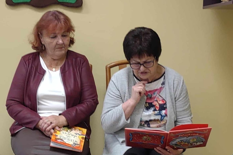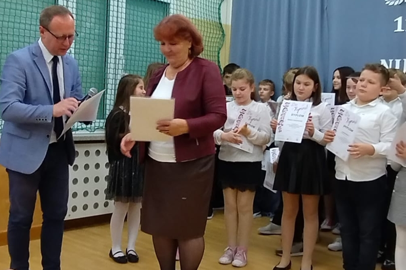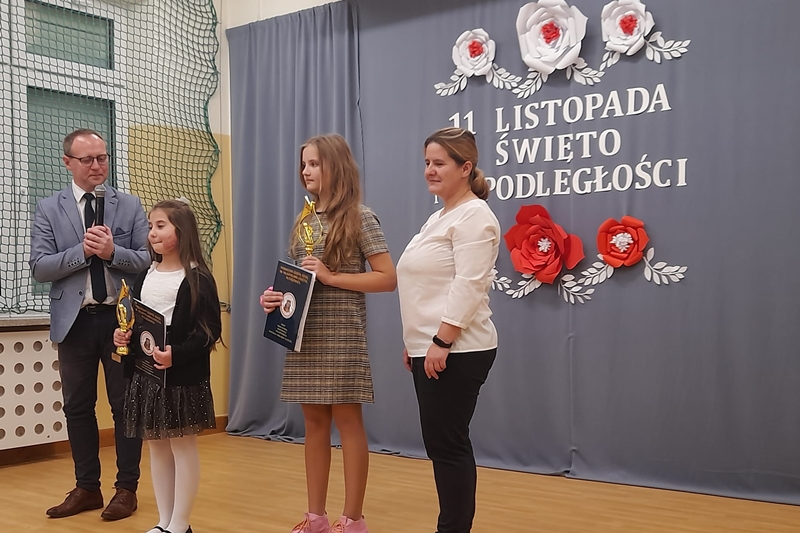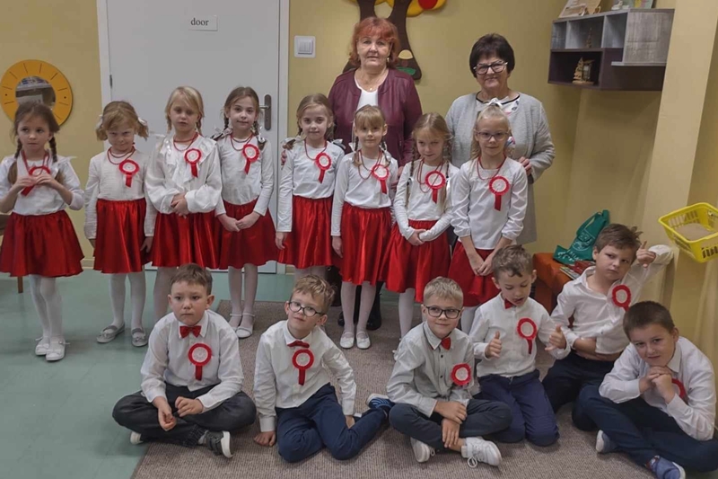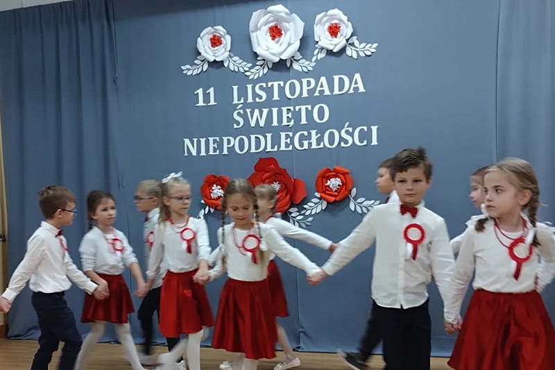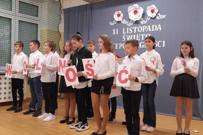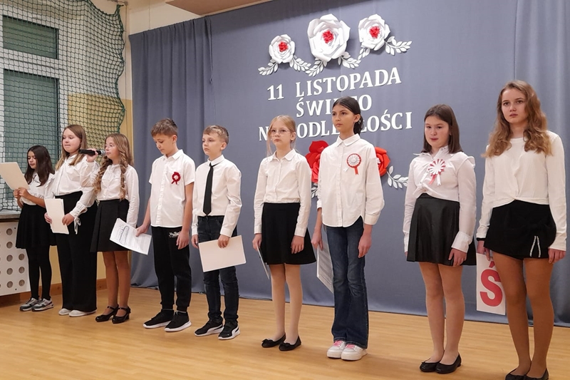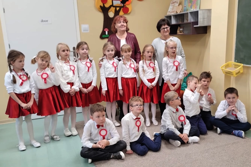 Koleżanka Ela czytała wiersze Marii Konopnickiej "Kto ty jesteś". Dzieci świetnie ten wiersz znały i bezbłędnie odpowiadały na pytania. Wiersz "Stefek Burczymucha ", też był dzieciom znany i bardzo lubiany. Ja przygotowałam książeczkę "Rechotek" Rafała Wejnera o żabce chwalipięcie, która została bohaterem. Z książki Wierszolandia wiersz "O tym jak turyści mali pożar w lesie wywołali, była to rymowanka o ochronie środowiska i zachowaniu się dzieci w lesie. Tu było miłe zaskoczenie dzieci z pierwszej klasy doskonale wiedzą, jak się zachowywać na spacerach, czy wycieczce w lesie. Niektóre dzieci biorą udział w sprzątaniu nie tylko świata, ale opowiadały, że z rodzicami zbierają śmieci. W domu segregują śmieci i wiedzą, że nie można płoszyć ptaków ani żadnych zwierząt krzykiem. Dzieci cierpliwie czekały z ręką w górze na swoją kolej z odpowiedzią. Pomagają rodzicom, mają swoje ulubione zajęcia, opiekują się domowymi zwierzątkami, lubią śpiewać i uczyć się. Zostaliśmy też zaproszeni na szkolny apel poświęcony "11 Listopada Święto Niepodległości". Nasze dzieci pięknie ubrane tańczyły Poloneza. Starsze śpiewały i recytowały patriotyczne wiersze. Na koniec wspólnie śpiewaliśmy pieśni patriotyczne z wyświetlonym tekstem na ekranie. Dzieci dostały statuetki i dyplomy za udział w konkursach, a dzisiejszy apel był zakończeniem całotygodniowego świętowania. My też dostaliśmy piękne dyplomy i pamiątkowe gadżety promujące szkołę oraz odblaskowe misie, które obiecaliśmy nosić, by być widocznymi o zmierzchu. Bardzo dziękujemy za zaproszenie, że mogliśmy uczestniczyć w czytaniu książeczek dla pierwszoklasistów. Mogliśmy porozmawiać i integrować się z najmłodszym pokoleniem w szkole, to dla nas Seniorów bardzo ważne. Dzieci bardzo ciepło nas przyjęły. Na samym początku zostaliśmy przedstawieni przez Pana Dyrektora i Panią Agnieszkę wychowawczynię pierwszaków jako przykład, że można się jeszcze uczyć nawet w naszym wieku. Dzisiejszy pobyt w szkole w Polichnie był bardzo uroczysty i miły. Dziękujemy serdecznie za zaproszenie, a dzieciom za radość jaką mogliśmy wspólnie przeżyć.