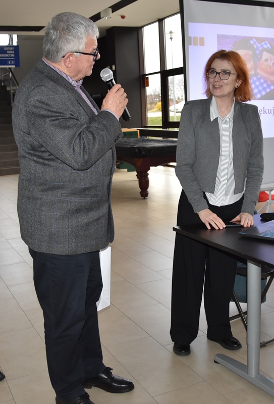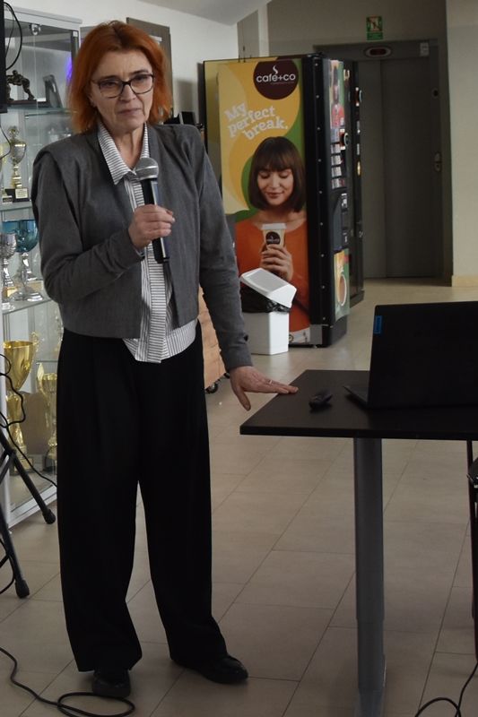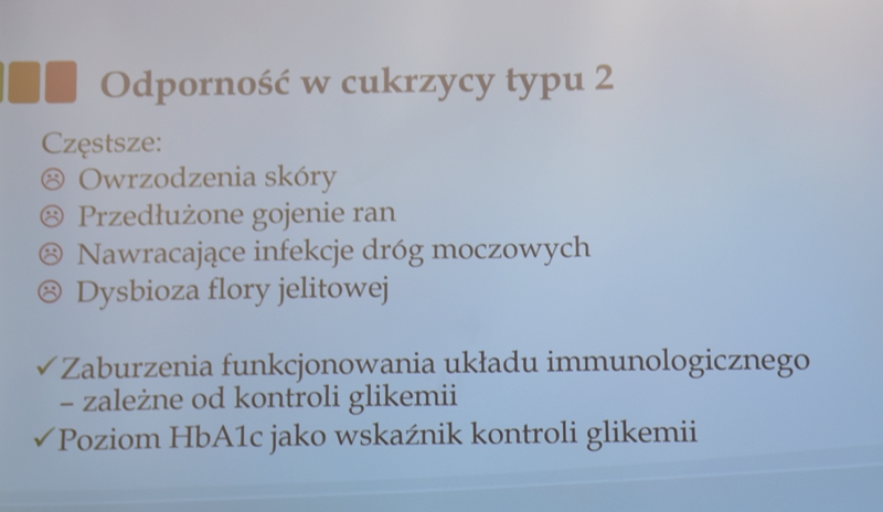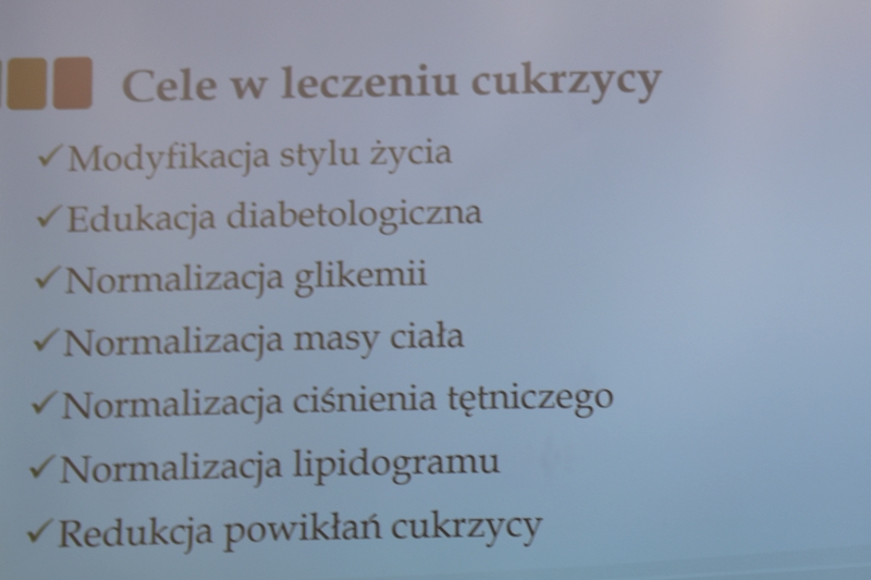 Działania prewencyjne polegają na: Edukacji prozdrowotnej. Aktywności fizycznej, co najmniej 150 min na tydzień. Redukcji masy ciała, np. 7% w skali roku. Duże znaczenie w leczeniu cukrzycy ma układ odpornościowy, a na jego funkcjonowanie ma wpływ przewód pokarmowy, jego powierzchnia wynosi 200 m2. Cukrzyca zwiększa ryzyko infekcji bakteryjnych, wirusowych, grzybicznych. Duży wpływ na przebieg cukrzycy t.2 mają czynniki takie jak: stres, depresja, palenie tytoniu, alkohol, brak snu – sen nie powinien trwać krócej niż 6 godz. Niezwykle ważna jest aktywność fizyczna: regularne ćwiczenia modelują odporność immunologiczną organizmu, regularny trening przeciwdziała stanom zapalnym, wpływa na różnorodność flory bakteryjnej. Regularny wysiłek fizyczny należy podejmować codziennie, przynajmniej co 2-3 dni. Aktywność fizyczna taka jak szybki spacer, nordic walking poprawiają insulinoterapię. Pani doktor zaproponowała przykładowe ćwiczenia na kręgosłup lędźwiowy, na biodra i kolana, na dłonie i nadgarstki. Szczególnie groźna w przebiegu cukrzycy jest otyłość, redukcja masy ciała nawet o 5% poprawia kontrolę glikemii. Ogólne zasady żywieniowe: Unikanie picia alkoholu. Przestrzegania zasad higieny przy przygotowywaniu posiłków. Wspólnie spożywanie posiłków. Dbanie o aktywność fizyczną. Suplementowanie diety, korzystanie z rzetelnych źródeł informacji żywieniowej. Dbanie o aktywność fizyczną. Dostosowanie wartość energetyczną diety do aktualnego poziomu aktywności fizycznej. Ważne zalecenia: Jedz różnorodną żywność, dużo warzyw i owoców, Stosuj żywność o niskim indeksie glikemicznym IG mniej niż 50, Nie objadaj się, nie stosuj głodówek, Jedz regularnie, Zalecane produkty o wysokiej zawartości błonnika, warzywa, produkty mleczne, drób, jaja, ryby, rośliny strączkowe. Zwracaj uwagę na wielkość porcji, jedz regularnie. Dbaj o nawadnianie organizmu co najmniej 8-10 szkl. dziennie napojów niskosłodzonych, Ograniczaj spożywanie cukru, soli i tłuszczów, Wybieraj chude mięsa, smażenie zastąp innymi technikami kulinarnymi. Uzupełniaj witaminy A,C,E, B6, B12, a szczególnie witaminę D. Cukrzyca zwiększa ryzyko zakażenia lub ciężkiego przebiegu niektórych chorób, warto więc zadbać o szczepienia ochronne na grypę, COVID, RSV, półpasiec. Na zakończenie p. doktor jeszcze raz przypomniała jak ważna jest aktywność fizyczna i właściwa dieta w leczeniu cukrzycy typu 2.
