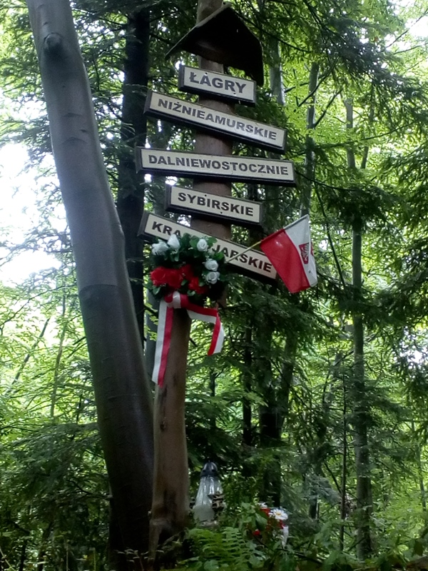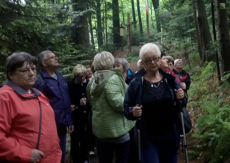 Poszliśmy leśną ścieżką zatrzymując się przy stacjach drogi krzyżowej, przy obeliskach i tablicach upamiętniających ofiary terroru: hitlerowskiego, stalinowskiego, II wojny światowej, stanu wojennego. Zatrzymaliśmy się przy symbolicznej mogile i krzyżu ofiar katastrofy smoleńskiej.