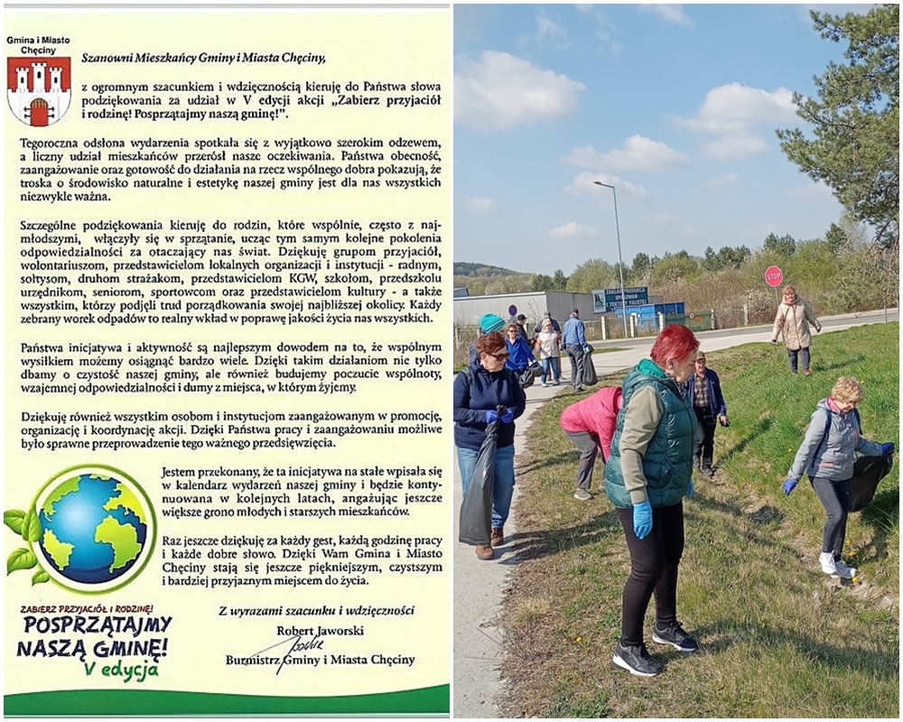 W dniu 17.04.2026 r. słuchacze Chęcińskiego Uniwersytetu Trzeciego Wieku (14 osób) uczestniczyli w sprzątaniu obwodnicy w kierunku Małogoszcza. Zebrano 10 worków różnego rodzaju śmieci.