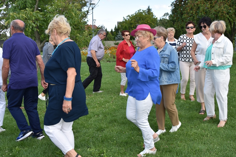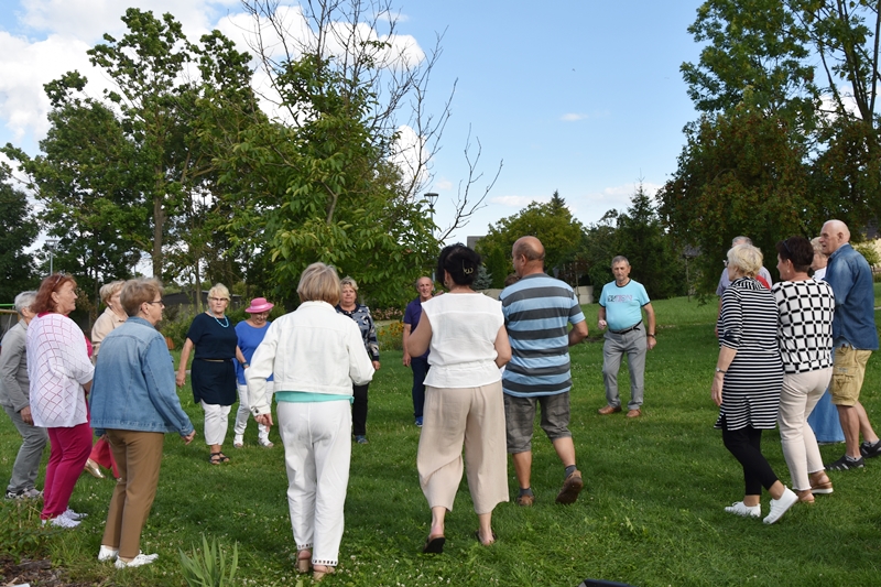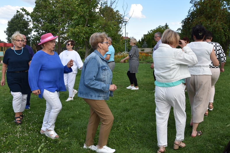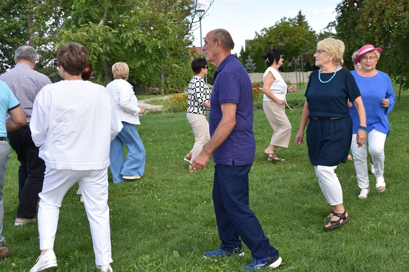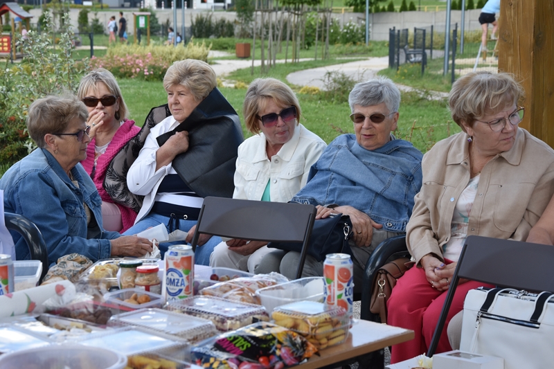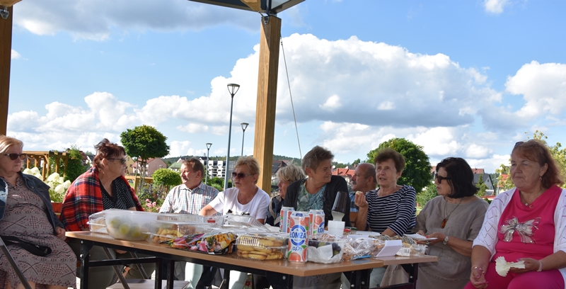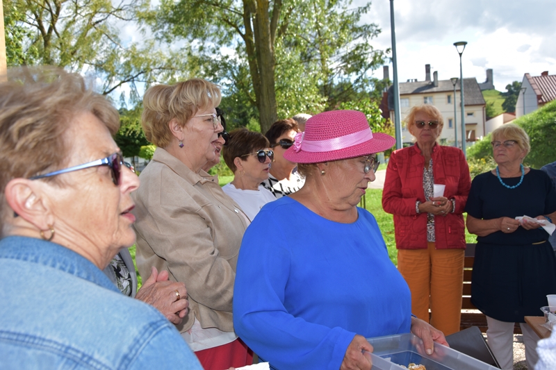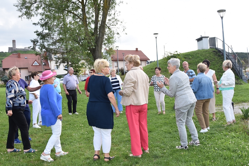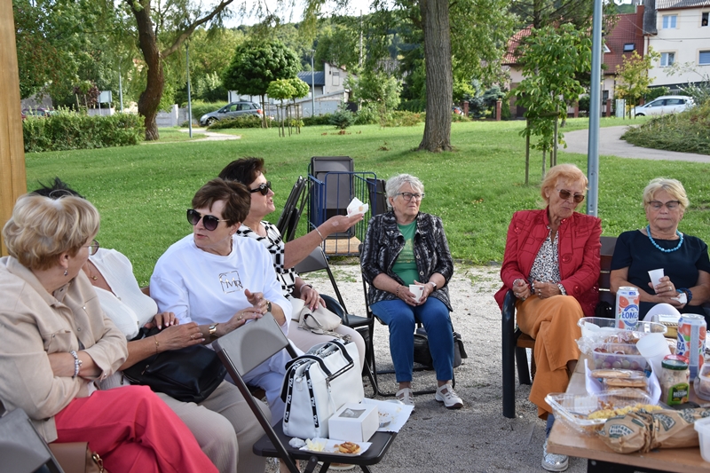 Spotkaliśmy się w Miejskim Parku na placu pod żaglami. Wprawdzie temat przewodni spotkania to ”Podwieczorek na trawie” my mieliśmy ławki, krzesełka i stoliki. To wszystko dzięki pracownikom Centrum Kultury i Sportu, którzy zawsze służą nam pomocą. Pani Prezes Zofia Puchała przekazała osobom wyjeżdżającym na wczasy do Rewala niezbędne informacje. Bawiliśmy się świetnie, słuchając ciekawych wspomnień. Kolega Mirek Ggół był oczywiście niezawodny-to nasz uniwersytecki disk dżokej. Grał utwory, które wszyscy znają i potrafią wspólnie zaśpiewać. W końcu towarzystwo ruszyło w tany. Nawet oporni tancerze dali wyciągnąć się na trawiasty parkiet. Dawno nie było tak przyjemnie i wesoło. Czas szybko płynie i nasza godzina parkowa dobiegła końca. Tak jak przystało, posprzątaliśmy po sobie, aby pozostawić to miejsce w takim stanie w jakim go zastaliśmy. We wspaniałych humorach wracaliśmy do własnych domów, z nadzieją, że spotkamy się ponownie 27 sierpnia. Będziemy wtedy porównywać Chęciny dawniej i dziś. Myślę, że dzisiejszy dzień dla wielu osób był powrotem do młodych lat, każdy z nas przyniósł „małe co nieco”. Były własne wypieki, czyli rogaliki i bułeczki, ciasta, owoce i jeszcze wiele innych rzeczy. Po prostu stoły uginały się od smakołyków. Dziękujemy wszystkim, którzy poświęcili swój wolny czas, aby pobyć chociaż godzinę wspólnie.