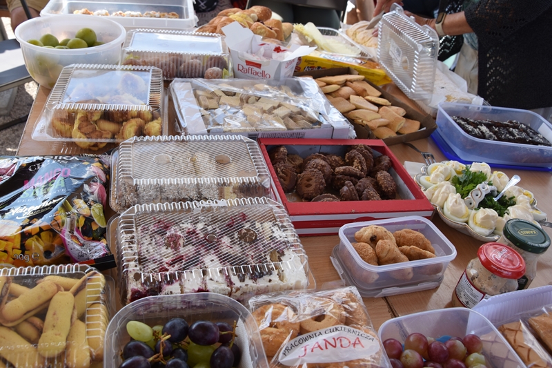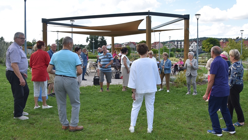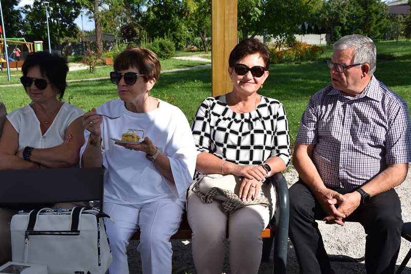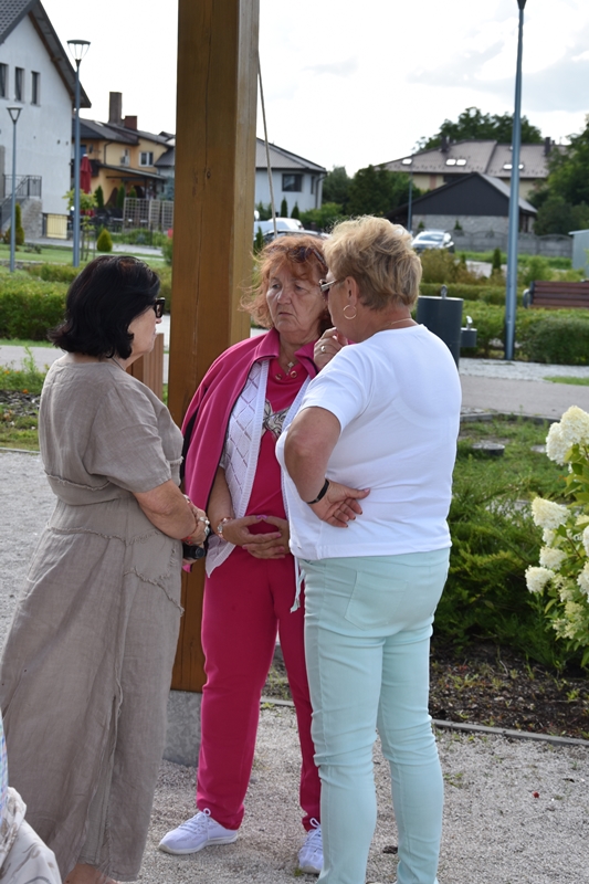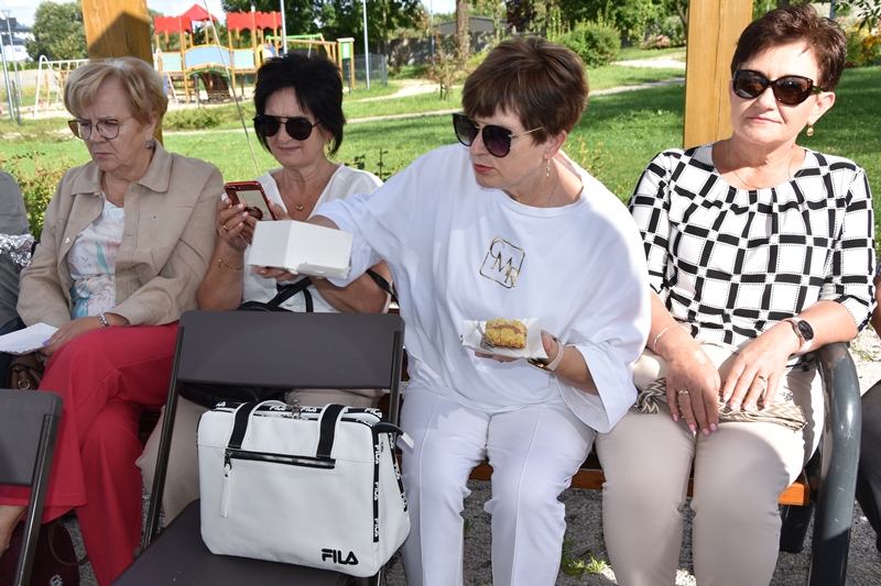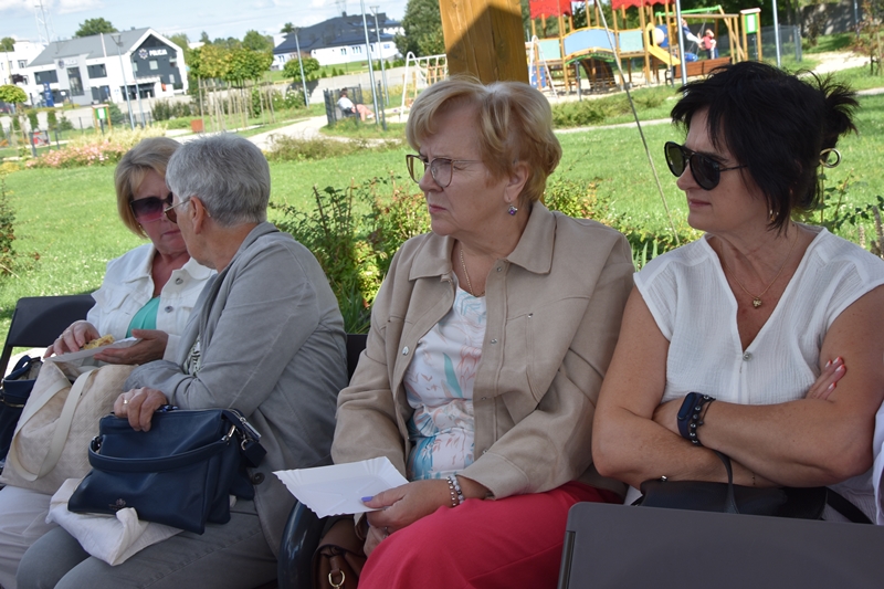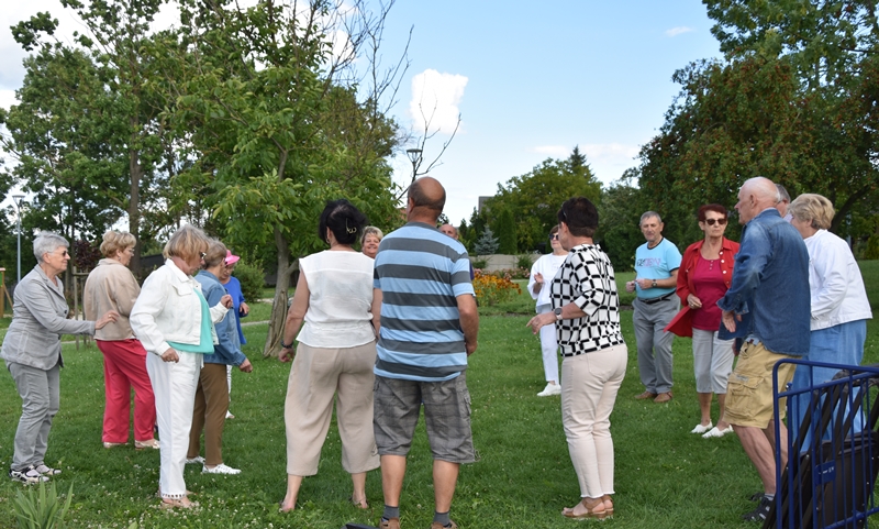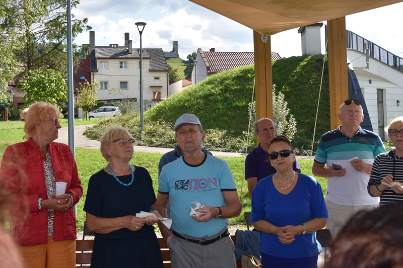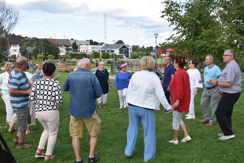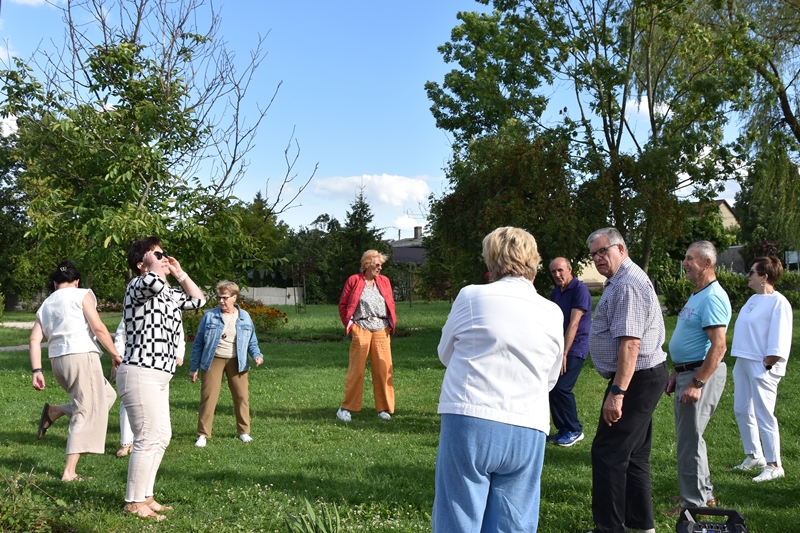 Spotkaliśmy się w Miejskim Parku na placu pod żaglami. Wprawdzie temat przewodni spotkania to ”Podwieczorek na trawie” my mieliśmy ławki, krzesełka i stoliki. To wszystko dzięki pracownikom Centrum Kultury i Sportu, którzy zawsze służą nam pomocą. Pani Prezes Zofia Puchała przekazała osobom wyjeżdżającym na wczasy do Rewala niezbędne informacje. Bawiliśmy się świetnie, słuchając ciekawych wspomnień. Kolega Mirek Ggół był oczywiście niezawodny-to nasz uniwersytecki disk dżokej. Grał utwory, które wszyscy znają i potrafią wspólnie zaśpiewać. W końcu towarzystwo ruszyło w tany. Nawet oporni tancerze dali wyciągnąć się na trawiasty parkiet. Dawno nie było tak przyjemnie i wesoło. Czas szybko płynie i nasza godzina parkowa dobiegła końca. Tak jak przystało, posprzątaliśmy po sobie, aby pozostawić to miejsce w takim stanie w jakim go zastaliśmy. We wspaniałych humorach wracaliśmy do własnych domów, z nadzieją, że spotkamy się ponownie 27 sierpnia. Będziemy wtedy porównywać Chęciny dawniej i dziś. Myślę, że dzisiejszy dzień dla wielu osób był powrotem do młodych lat, każdy z nas przyniósł „małe co nieco”. Były własne wypieki, czyli rogaliki i bułeczki, ciasta, owoce i jeszcze wiele innych rzeczy. Po prostu stoły uginały się od smakołyków. Dziękujemy wszystkim, którzy poświęcili swój wolny czas, aby pobyć chociaż godzinę wspólnie.