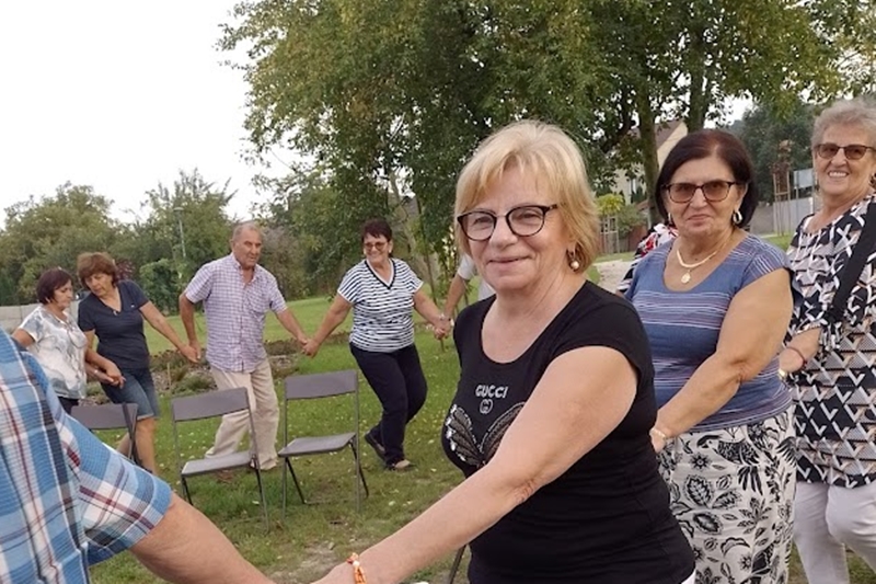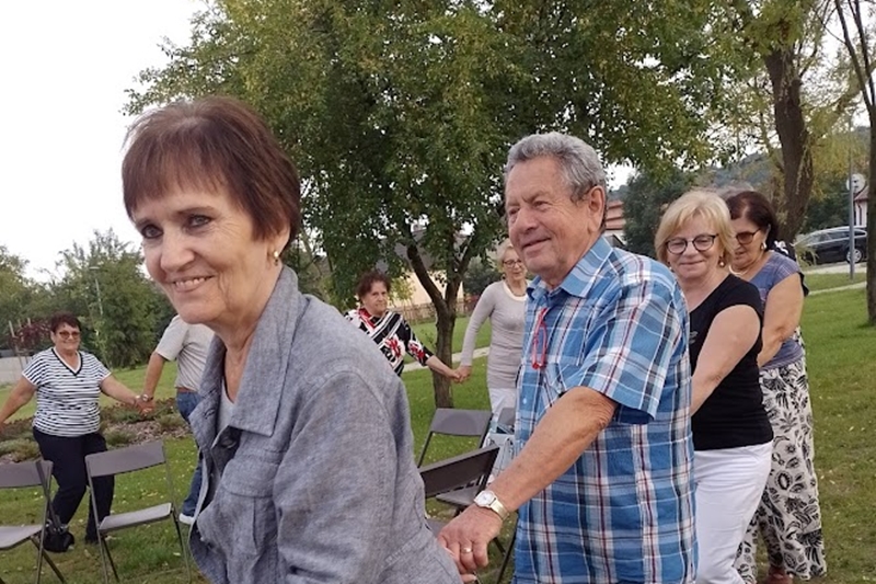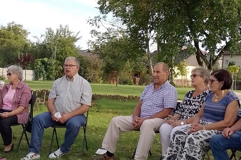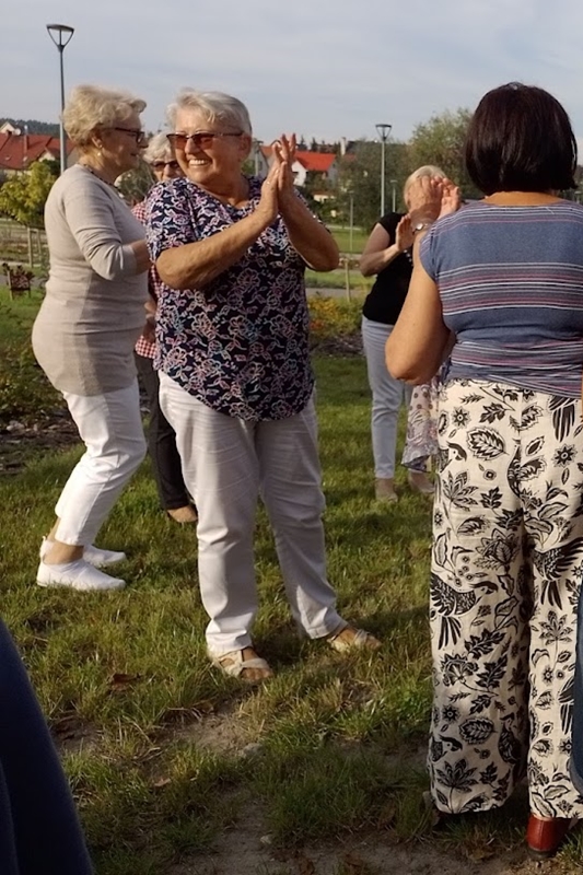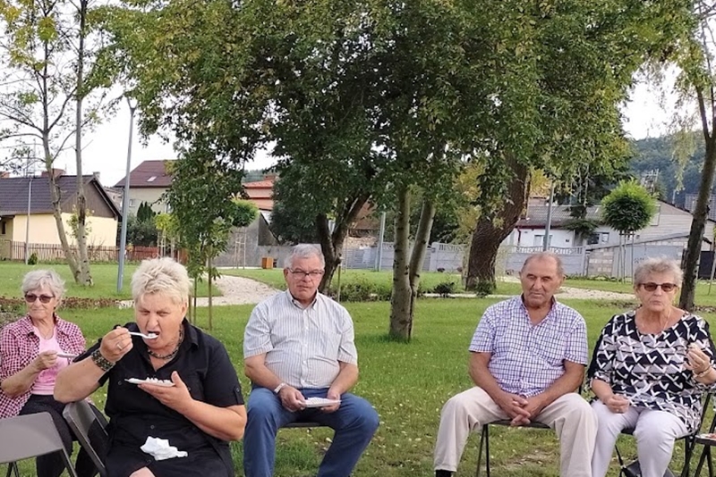 Temat spotkania to "Podwieczorek w parku". Stół bogaty dużo różnego i smacznego jedzenia. Było bardzo sympatycznie, Podwieczorek przekształcił się w biesiadę, bo było smacznie, śpiewnie i tanecznie przy muzyce kolegi Edzia