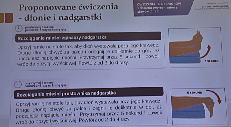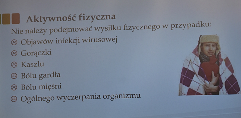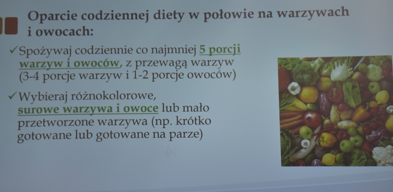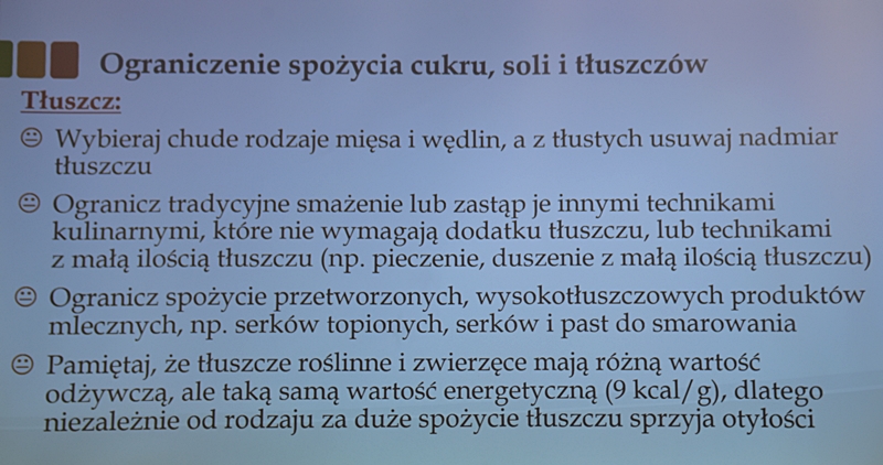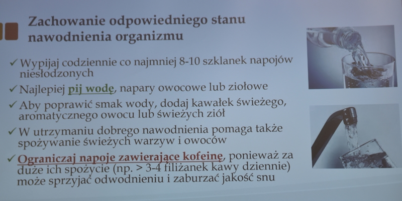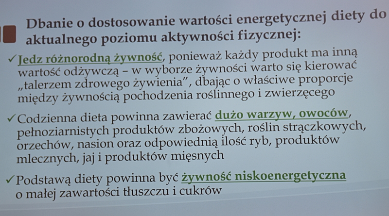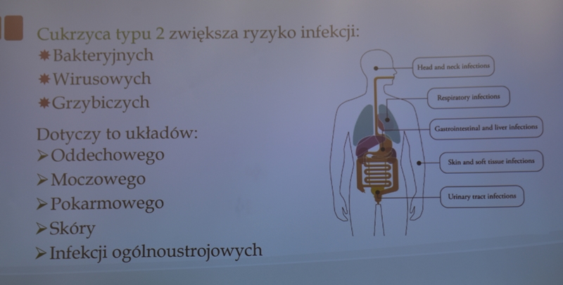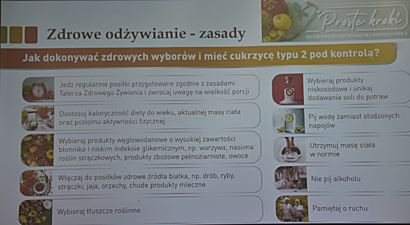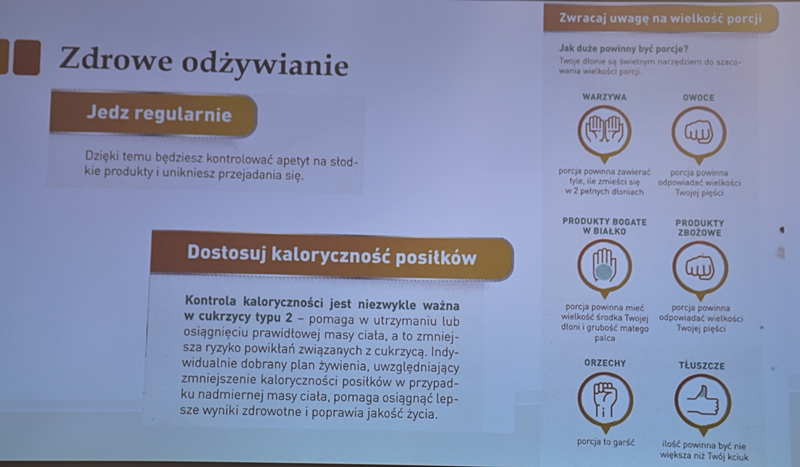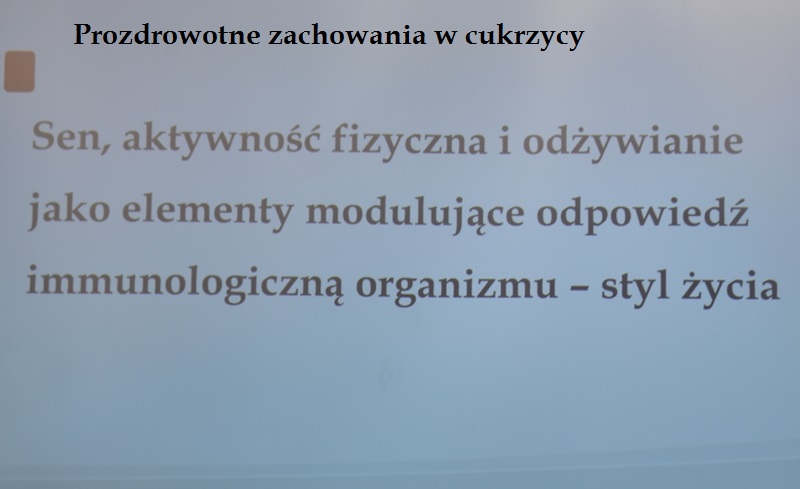 Działania prewencyjne polegają na: Edukacji prozdrowotnej. Aktywności fizycznej, co najmniej 150 min na tydzień. Redukcji masy ciała, np. 7% w skali roku. Duże znaczenie w leczeniu cukrzycy ma układ odpornościowy, a na jego funkcjonowanie ma wpływ przewód pokarmowy, jego powierzchnia wynosi 200 m2. Cukrzyca zwiększa ryzyko infekcji bakteryjnych, wirusowych, grzybicznych. Duży wpływ na przebieg cukrzycy t.2 mają czynniki takie jak: stres, depresja, palenie tytoniu, alkohol, brak snu – sen nie powinien trwać krócej niż 6 godz. Niezwykle ważna jest aktywność fizyczna: regularne ćwiczenia modelują odporność immunologiczną organizmu, regularny trening przeciwdziała stanom zapalnym, wpływa na różnorodność flory bakteryjnej. Regularny wysiłek fizyczny należy podejmować codziennie, przynajmniej co 2-3 dni. Aktywność fizyczna taka jak szybki spacer, nordic walking poprawiają insulinoterapię. Pani doktor zaproponowała przykładowe ćwiczenia na kręgosłup lędźwiowy, na biodra i kolana, na dłonie i nadgarstki. Szczególnie groźna w przebiegu cukrzycy jest otyłość, redukcja masy ciała nawet o 5% poprawia kontrolę glikemii. Ogólne zasady żywieniowe: Unikanie picia alkoholu. Przestrzegania zasad higieny przy przygotowywaniu posiłków. Wspólnie spożywanie posiłków. Dbanie o aktywność fizyczną. Suplementowanie diety, korzystanie z rzetelnych źródeł informacji żywieniowej. Dbanie o aktywność fizyczną. Dostosowanie wartość energetyczną diety do aktualnego poziomu aktywności fizycznej. Ważne zalecenia: Jedz różnorodną żywność, dużo warzyw i owoców, Stosuj żywność o niskim indeksie glikemicznym IG mniej niż 50, Nie objadaj się, nie stosuj głodówek, Jedz regularnie, Zalecane produkty o wysokiej zawartości błonnika, warzywa, produkty mleczne, drób, jaja, ryby, rośliny strączkowe. Zwracaj uwagę na wielkość porcji, jedz regularnie. Dbaj o nawadnianie organizmu co najmniej 8-10 szkl. dziennie napojów niskosłodzonych, Ograniczaj spożywanie cukru, soli i tłuszczów, Wybieraj chude mięsa, smażenie zastąp innymi technikami kulinarnymi. Uzupełniaj witaminy A,C,E, B6, B12, a szczególnie witaminę D. Cukrzyca zwiększa ryzyko zakażenia lub ciężkiego przebiegu niektórych chorób, warto więc zadbać o szczepienia ochronne na grypę, COVID, RSV, półpasiec. Na zakończenie p. doktor jeszcze raz przypomniała jak ważna jest aktywność fizyczna i właściwa dieta w leczeniu cukrzycy typu 2.