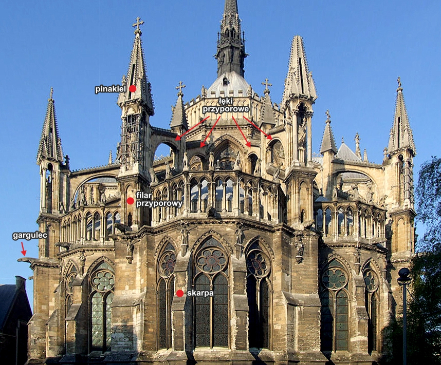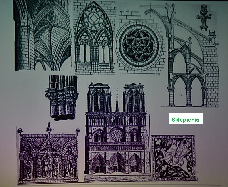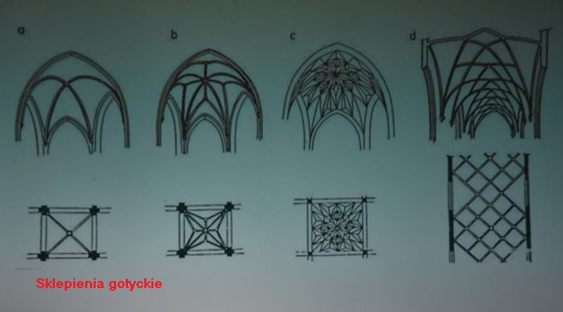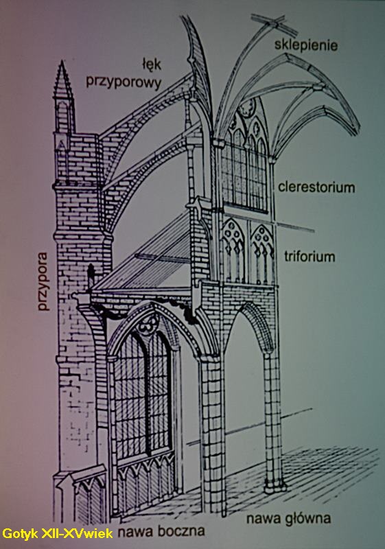 Ciężaru stropu i sklepień nie dźwigały ściany, lecz – przez wymurowane z kamienia żebra, ciężar był przenoszony na specjalne filary (przypory). Między żebrami i przyporami powstawały łuki przyporowe. Architektura gotycka w zamierzeniu jej twórców miała odzwierciedlać boską naturę i wielbić Boga. Ewolucję w gotyku przeszło sklepienie krzyżowe. Powstało krzyżowo – żebrowe a potem wiele innych odmian. W okresie gotyku najczęściej budowano kościoły. Architektura gotycka to: maswerk (rozety – dekoracyjne wzory), pinakle (wieżyczki), wimperga (dekoracyjne wykończenie w kształcie wysokiego trójkąta).