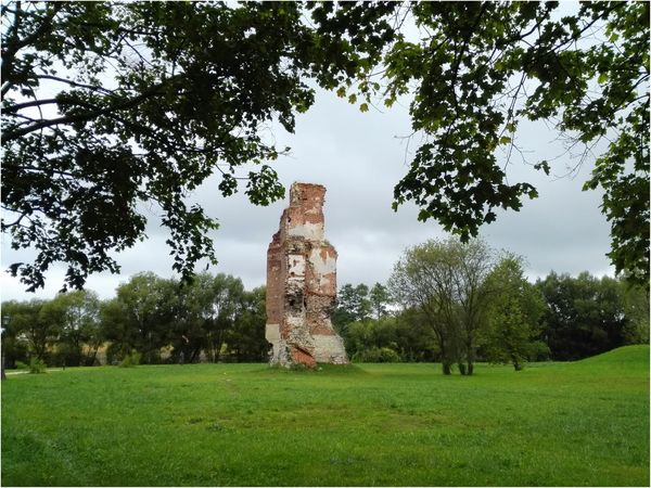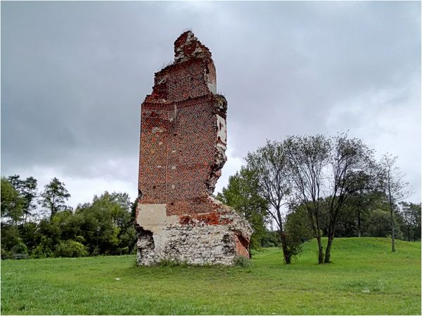 Opis: Pozostałości zamku znajdują się w centralnej części miejscowości, w obrębie szerokiej, płaskiej doliny rzeki Czarnej. Na powierzchni terenu zachował się wysoki relikt narożnika budynku zamkowego, z fragmentem skośnej przypory, wzniesionych z cegły zwykłej i zendrówki, zdobiącej lico w układzie romboidalnym. Oprócz tego w górnej części muru widoczny jest fragment fryzu z cegły kładzionej na rąb ukośny. Na licach wewnętrznych ocalałego reliktu widoczne są gniazda belek stropowych i fragmenty tynków na poziomach trzech kondygnacji. Reliktowi towarzyszy wał ziemny, kryjący resztki zabudowy zamkowej. Wyniki badań wykopaliskowych pozwoliły na wyróżnienie co najmniej dwóch faz rozwojowych zamku. Z końcem XIV w. łączy się jednotraktowy, trzykondygnacyjny budynek o wymiarach 13 x 39 m; jego reliktem jest ocalały do dziś narożnik ze szkarpą. Analogiczny dom miał stać na pn. od niego, po drugiej stronie dziedzińca. W drugiej fazie, datowanej na pierwszą połowę XV w., wybudowano obwodowy mur obronny na rzucie prostokąta, a przy jego pn. odcinku stanął dom wielki. Nie wiadomo gdzie była zlokalizowana brama wjazdowa; przypuszcza się, że mogła się ona znajdować we wsch. odcinku muru obronnego.